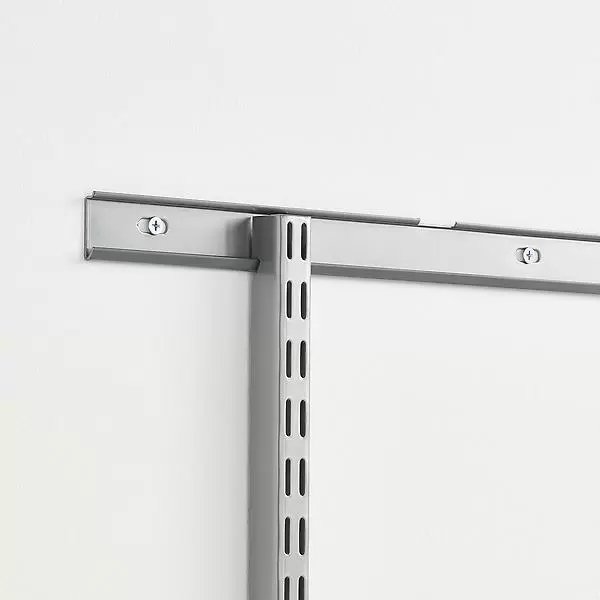 Once the bolts were in, she installed the top track and screwed it in. The vertical attachments that support the brackets are even easier to attach. These pieces hook onto the track at the very end and slide across it. Finally, the brackets that support the wood shelves hook into the attachments.