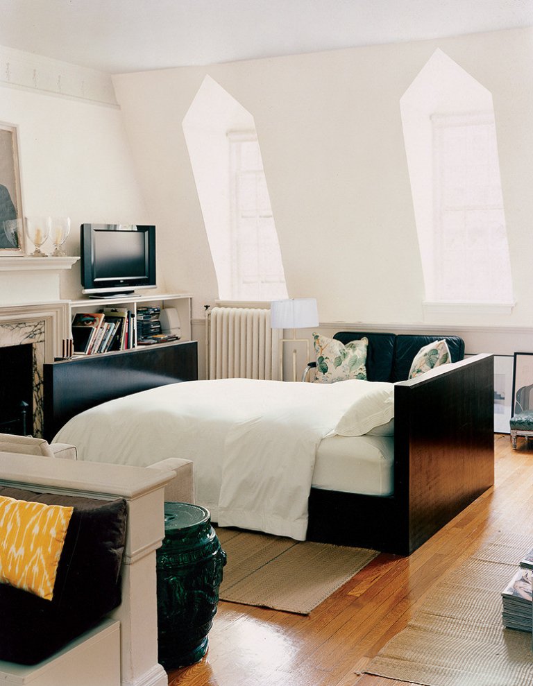 An all-white aesthetic isn’t always a must for small spaces. Don’t be afraid to go a little deep with the paint color, granted there’s plenty of natural light to compensate.