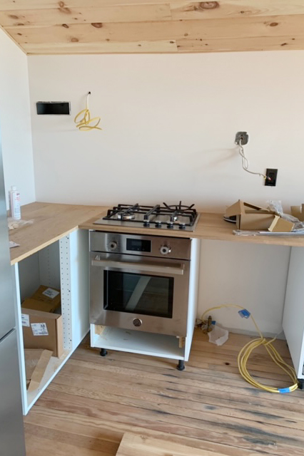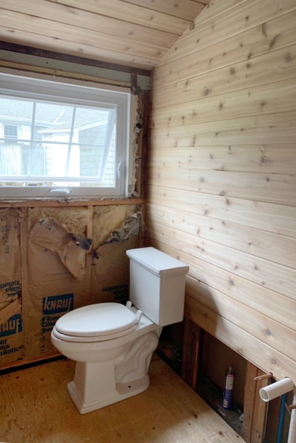 The structures, each around 700 square feet, were in different states of disrepair. “We decided to fix up the ugliest one first,” Connors says of the cabin that would become their main living space, which had 7-foot ceilings, faux marble countertops, and (he estimates) nine types of flooring. Many contractors weren’t interested in a salvage-first, budget-conscious project, so the couple brought on a local carpenter to execute the structural work and managed the rest of the renovations themselves. As they stripped away decades of bad updates, the duo uncovered a handful of happy surprises, including a painting of a black cat on the pinewood-paneled walls. “You can see it peeking out behind my dresses in the closet,” says Seven. Here, they look back on putting down roots—this time on solid ground.