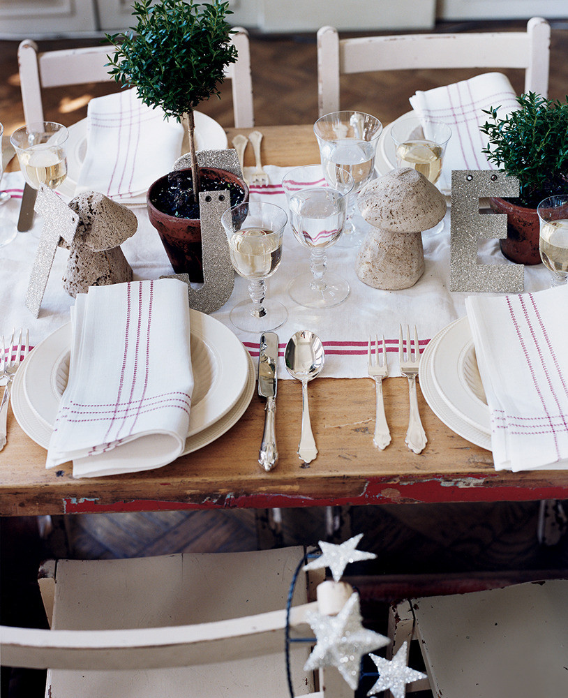 Skip the tablecloth and opt for simple linens with ornate silverware and natural textures.