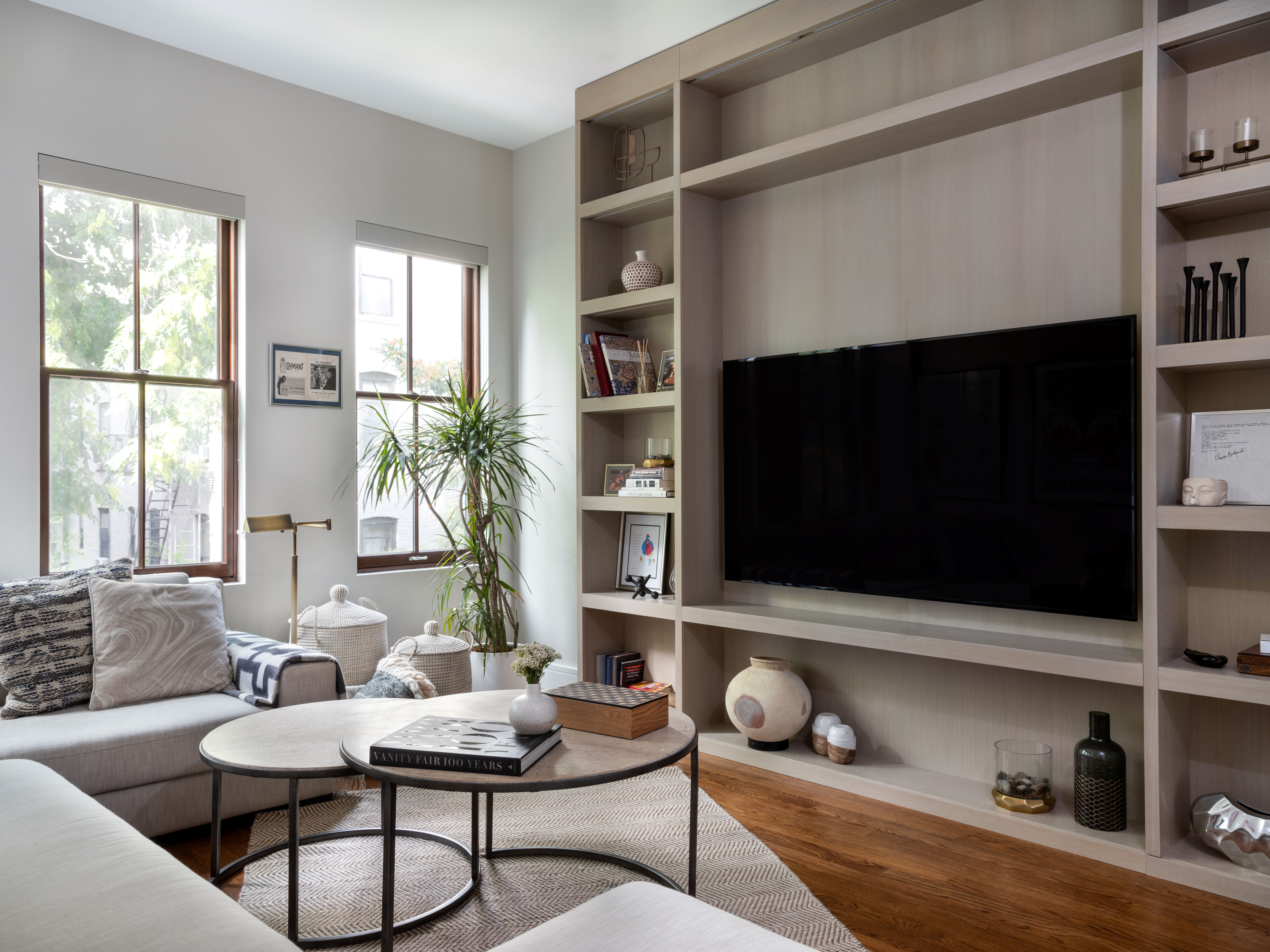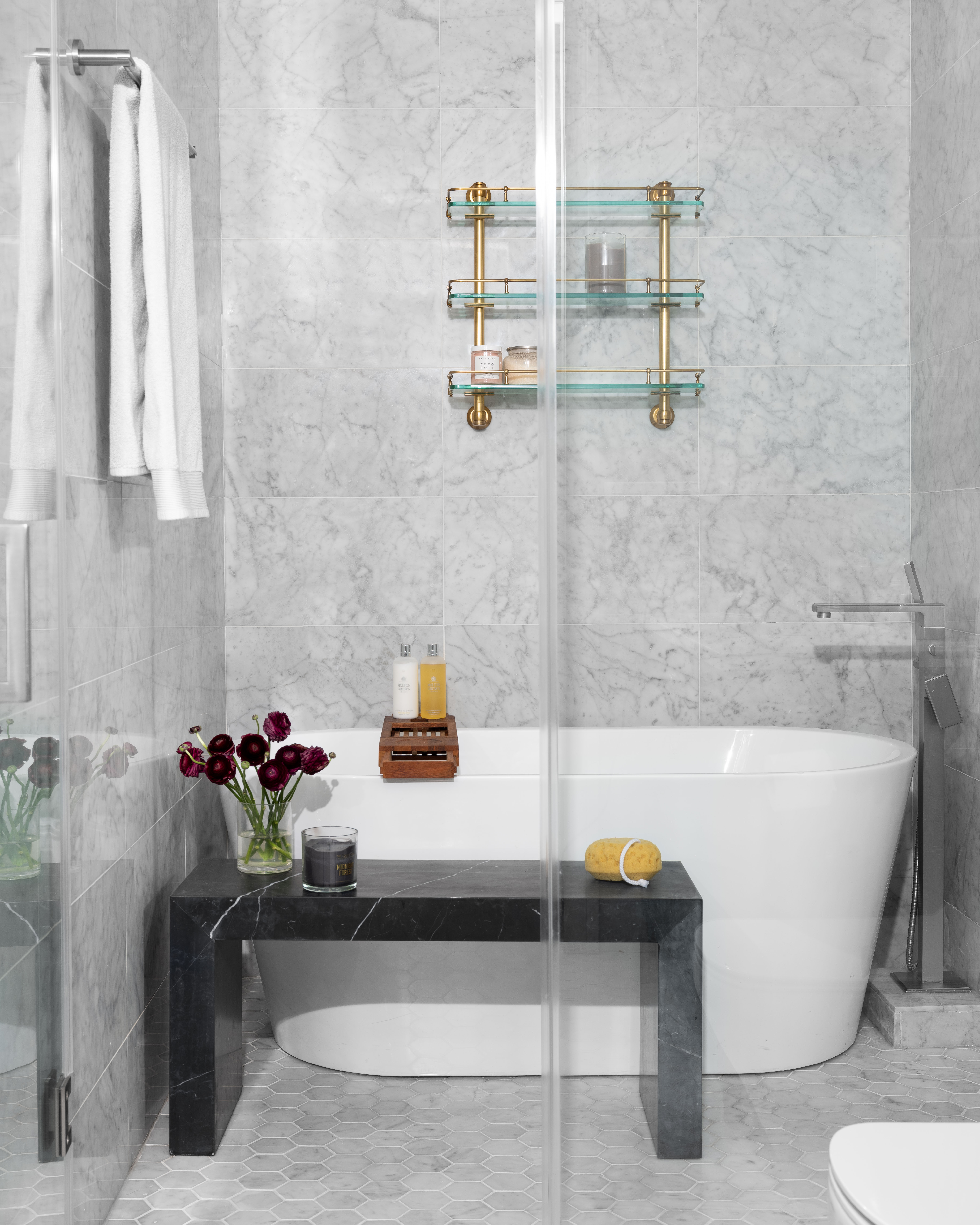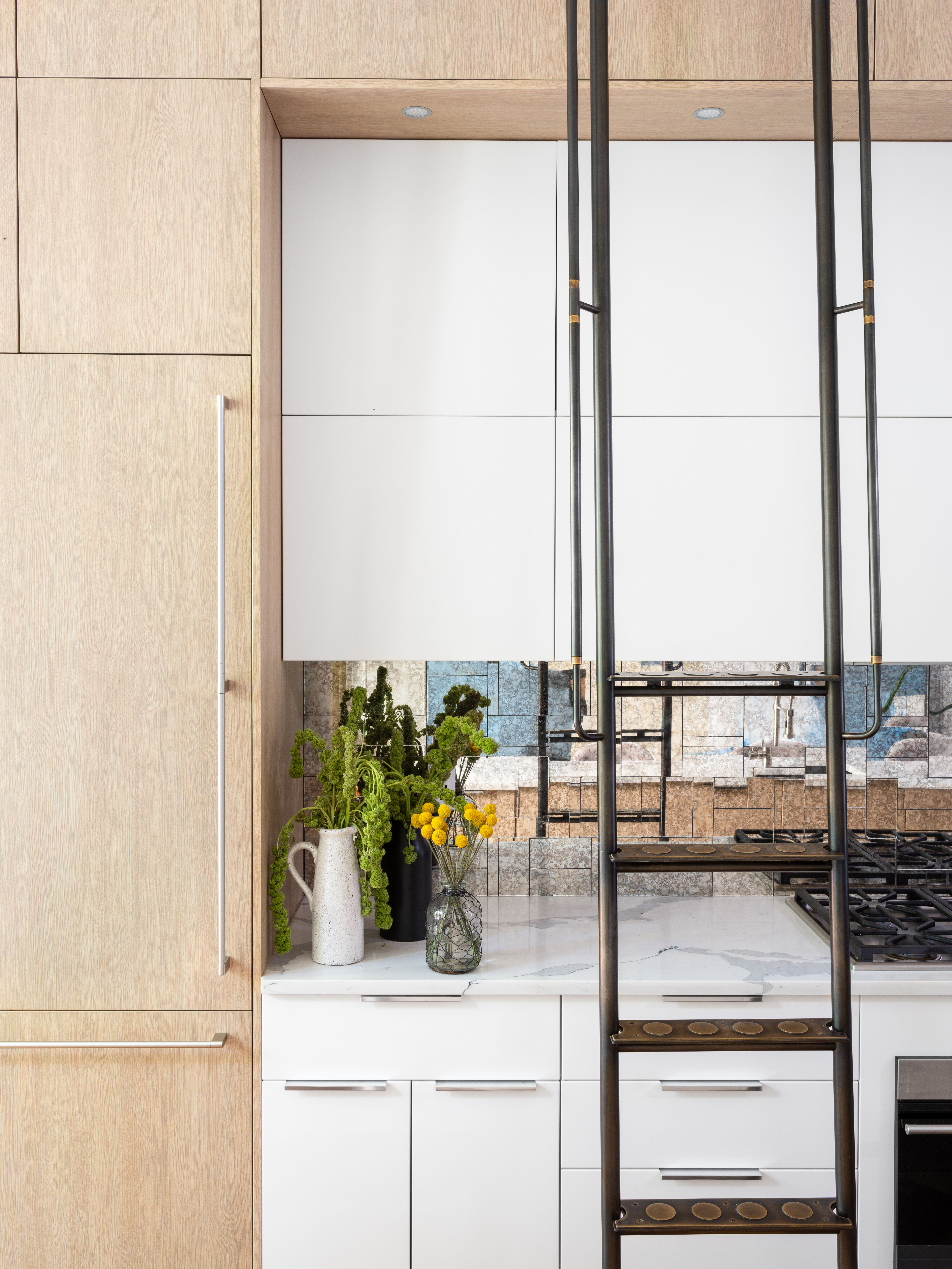 The kitchen already featured floor-to-ceiling storage (and 14-foot ceilings) but it was difficult to access the higher cupboards, so the designer added a custom rolling ladder worthy of a modern version of Beauty and the Beast. Arguably, this is the feature that gives the home its custom, bespoke feel and makes the whole space that much more functional.