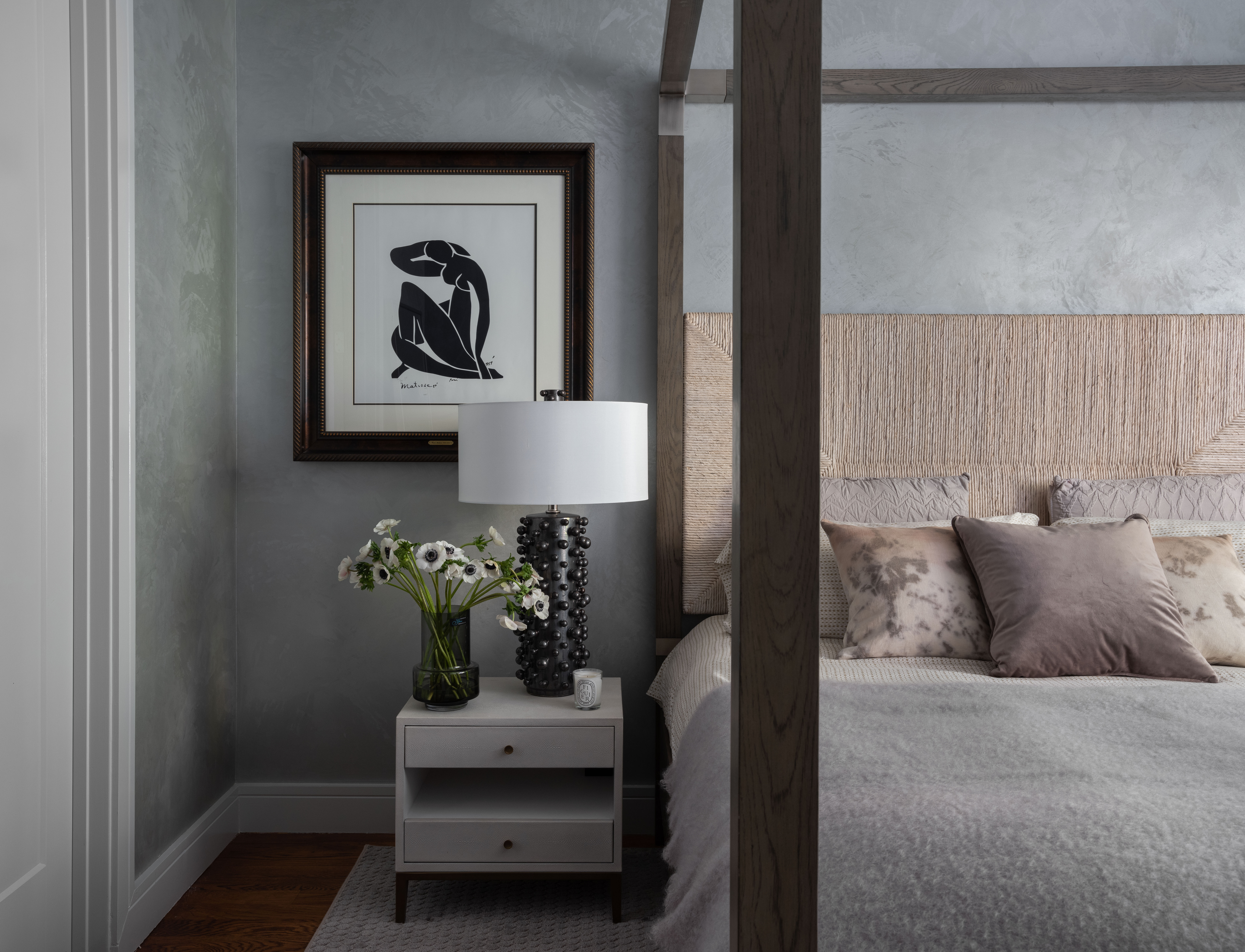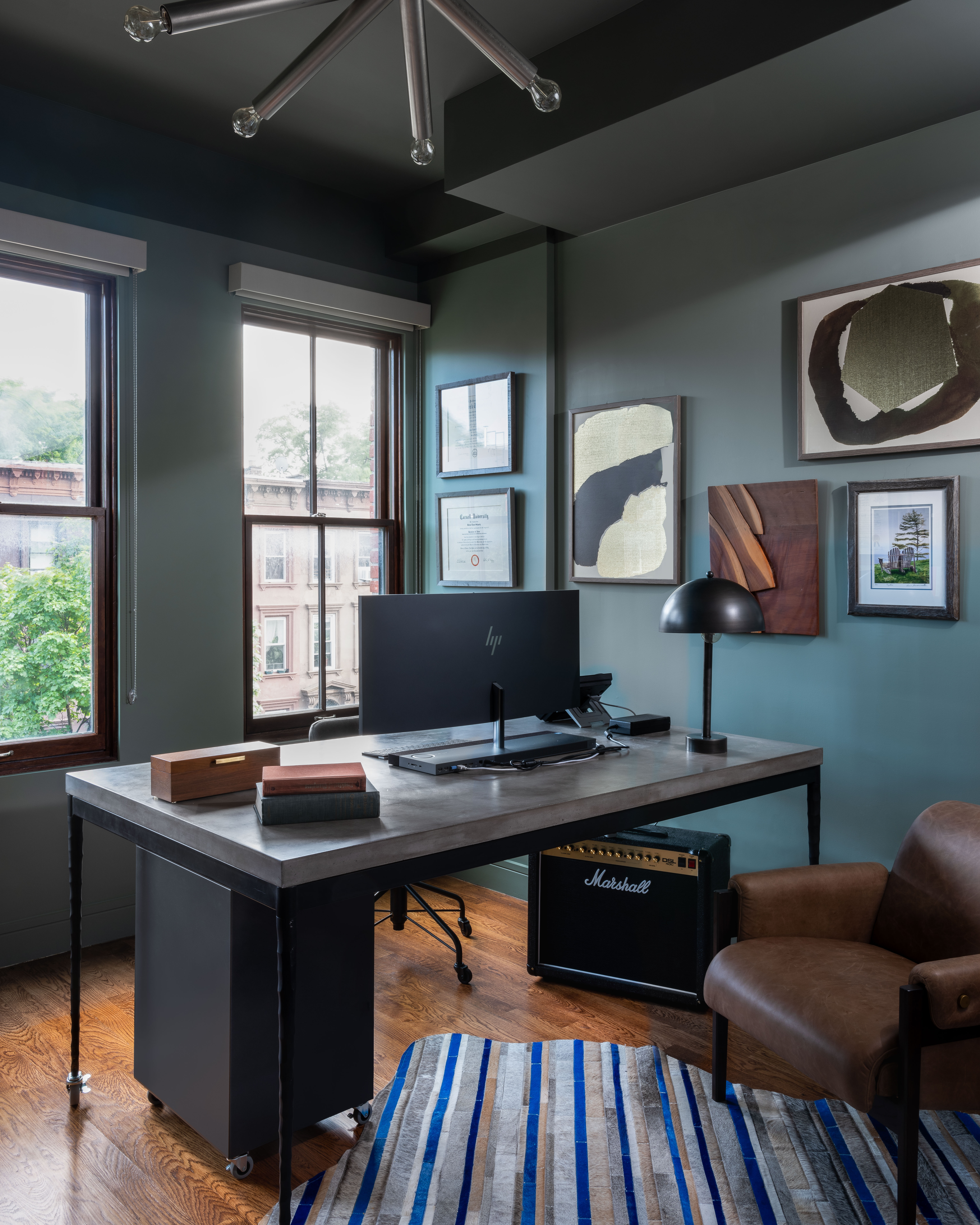 The first major moment is quite subtle and comes in the form of a deep blue headboard in the guest room. As the floors get higher, the rooms get increasingly moodier: a black-and-teal home office and a textured and warm gray master bedroom: “Our inspiration for the office was a cigar lounge, and the master bedroom was to feel like a hotel,” adds the designer.