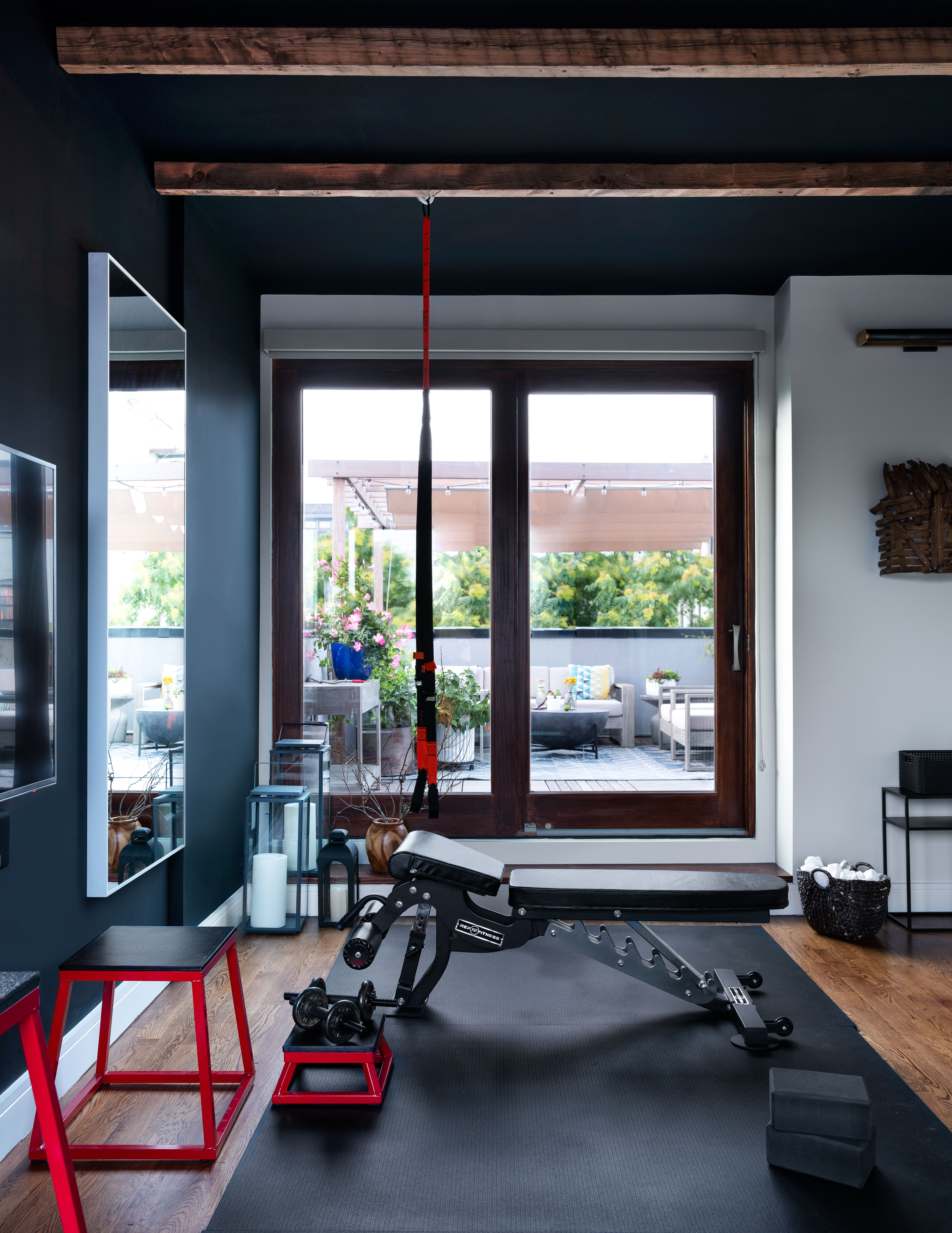 The crown jewel of this Crown Heights brownstone: a moody and dramatic home gym with black ceilings and reclaimed beams that open up onto a colorful rooftop terrace. “The penthouse gym had to be black and sexy, with reclaimed beams,” says Weiss, of the top floor, which boasts two balconies. What the home once lacked in character, it now more than makes up for in beautiful bespoke details and bold color choices.