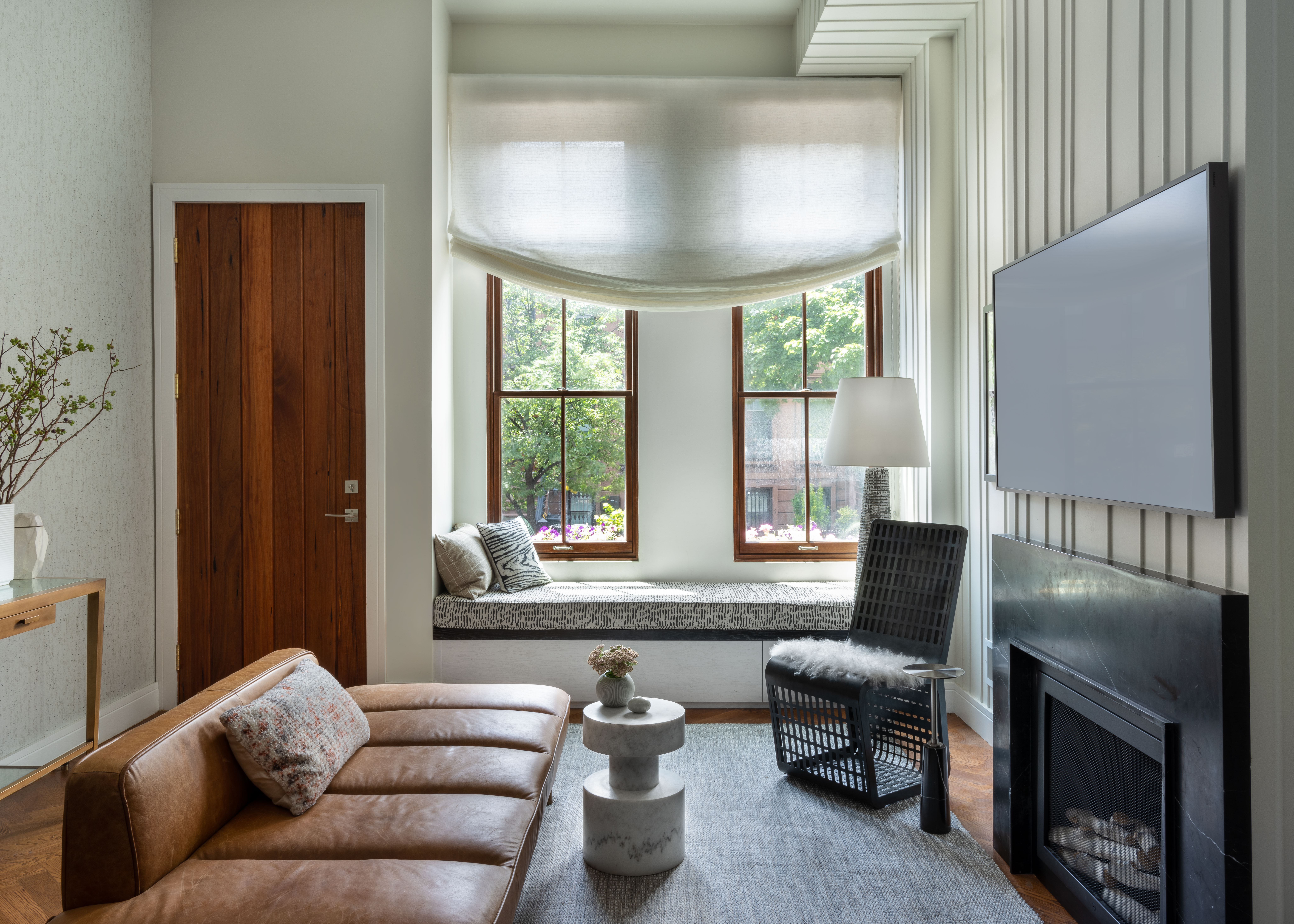 The custom black marble fireplace was another addition, as was the built-in window seat, which gave the space less of a cookie-cutter look. With a restricted amount of space on the ground floor, Weiss wanted to maximize the cohesive and airy look and feel of the space, adding a textured wallpaper on one wall and replacing the heavy wood staircase railing for a lighter black metal one. The designer even added a doggy room for the couple’s two pups.