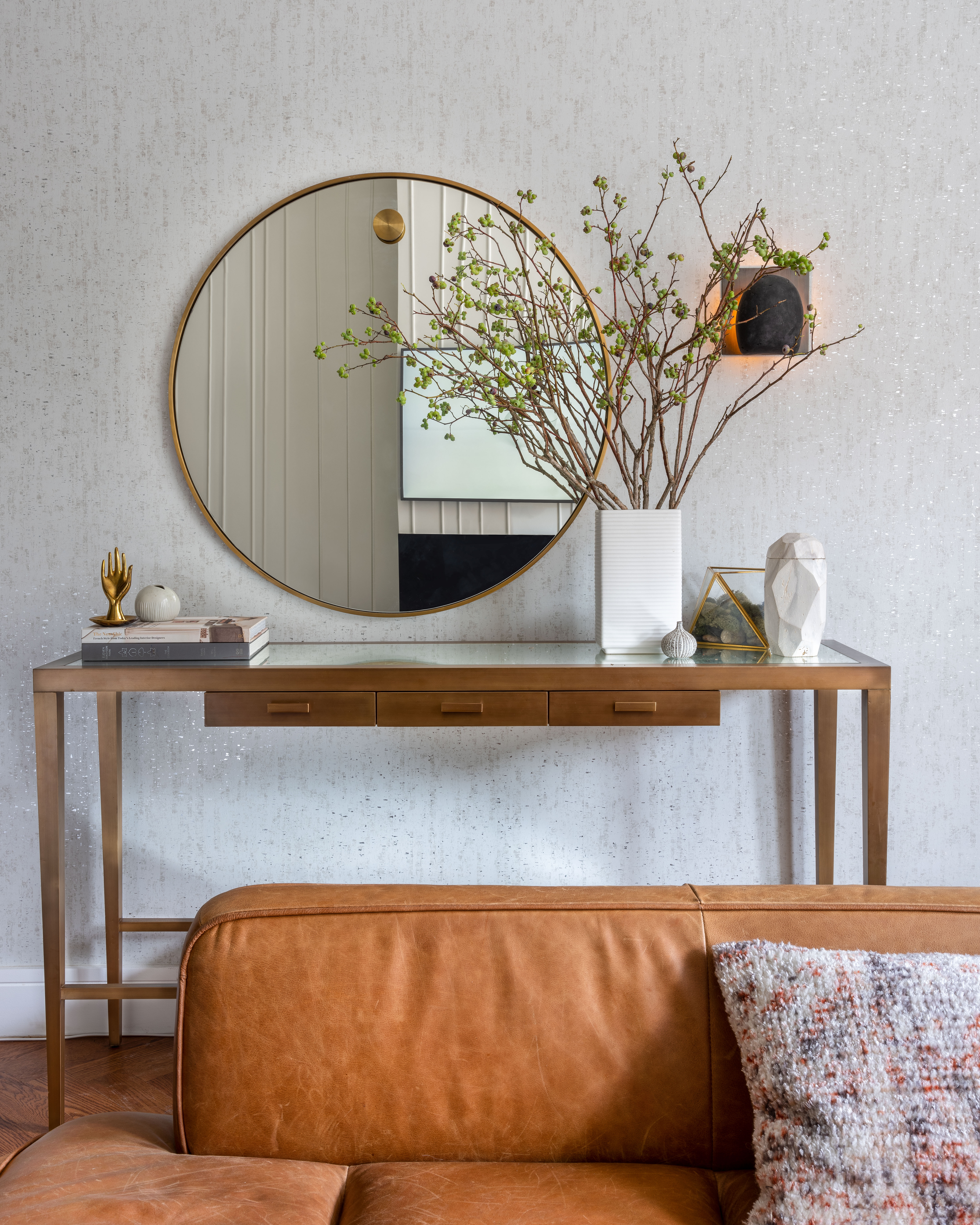 The newly built home was already modernized—boasting herringbone floors, Italian marble in the kitchen, and classic wood windows—but it lacked the much-needed charm of older townhomes in the neighborhood. Weiss added a modern molding pattern to one of the walls on the first floor to give it character and texture. “I came up with the molding concept to add texture,” she explains of the custom wall which runs the entire first floor.