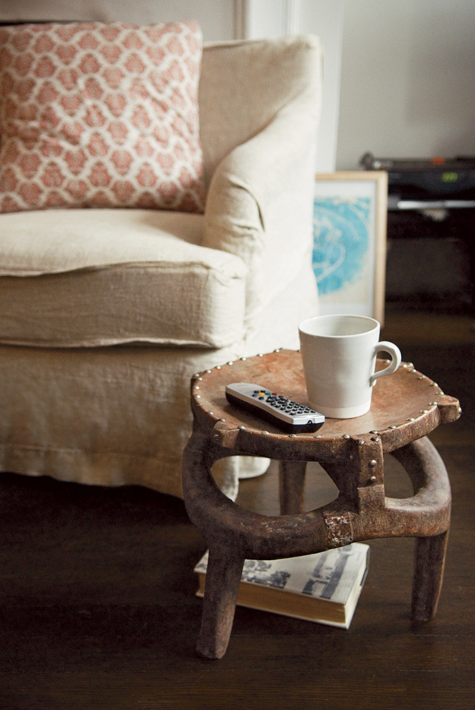 A simple accent piece doubles as a geographically-convenient (and temporary) spot for all the neccessities for a little lounge time.