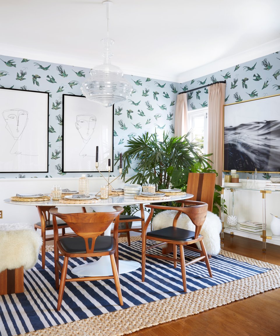 The wallpaper sets the tone for the dining room perfectly. Eclectic yet not dysfunctional and playful yet not juvenile, it anchors a space that’s all about juxtaposition.