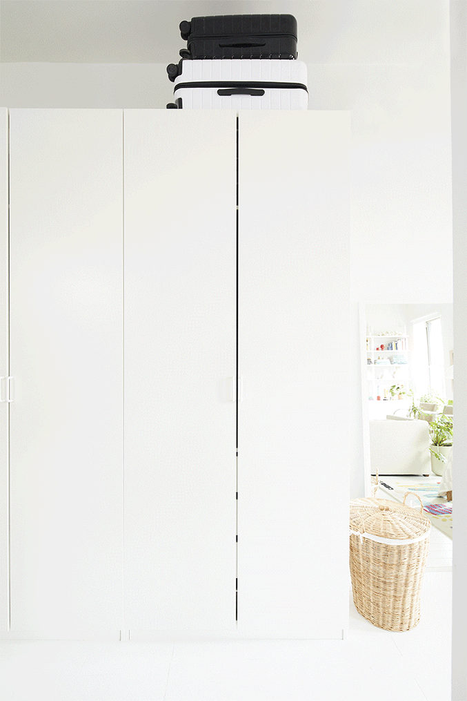 Levy knew she would have to create her own storage. After researching various options, she decided to invest in three Ikea Pax units that she customized in-store with a professional—an exercise she highly recommends over going it alone online. They fit perfectly along the wall between her bedroom and kitchen. Her only other organizing advice: Invest in clear shoe boxes (hers are $1 from Amazon!) to help avoid piles.