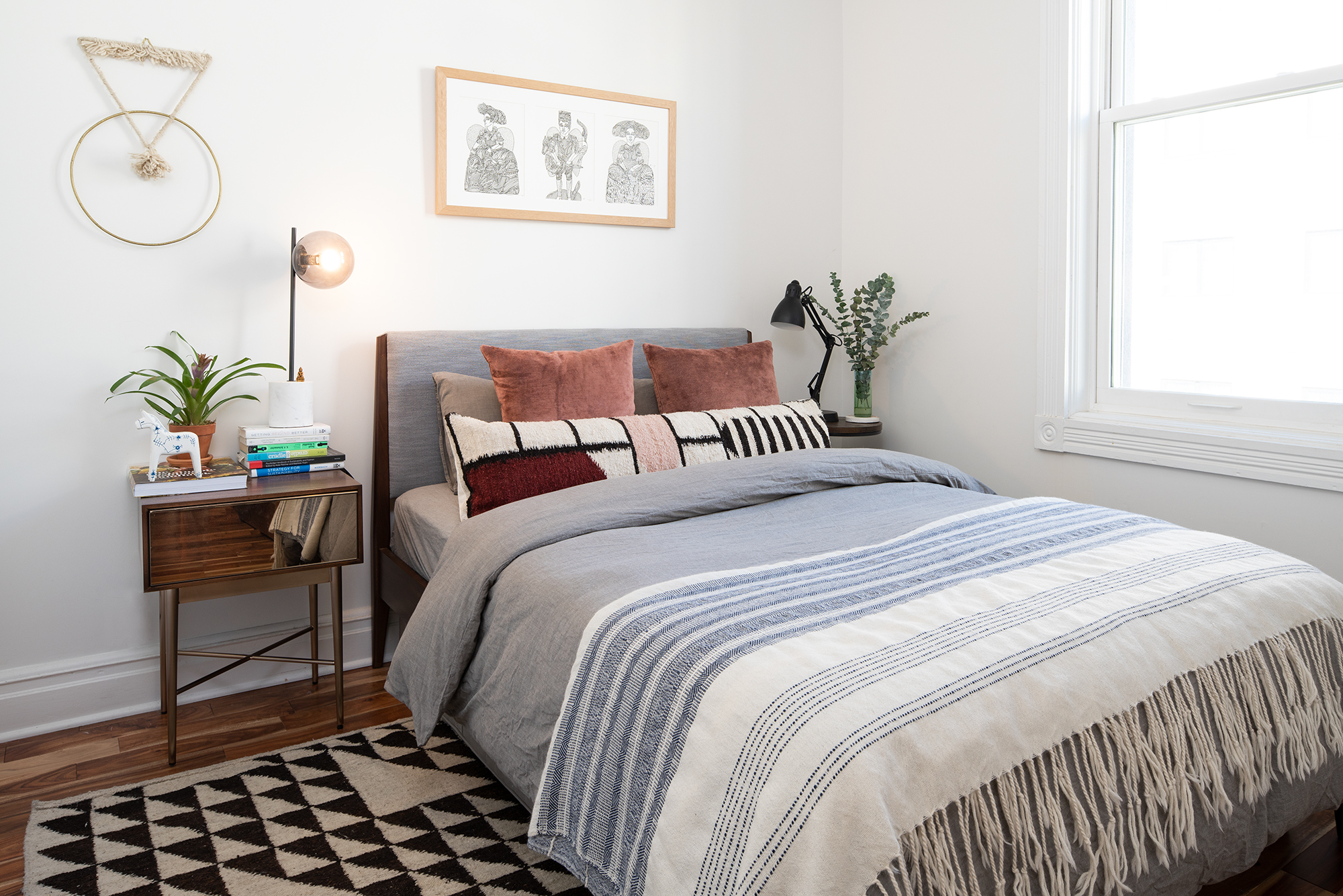 For a visual surprise in the bedroom, the couple flanked the Modern Show Wood Bed with asymmetrical side tables and lamps, all from West Elm. Calming gray organic cotton linens from Muji, a graphic lumbar pillow from Meso Goods, and a hand-woven alpaca throw picked up in Peru envelop the bed, while three ink drawings by the Guatemalan artist Marlov Barrios hang above it.
