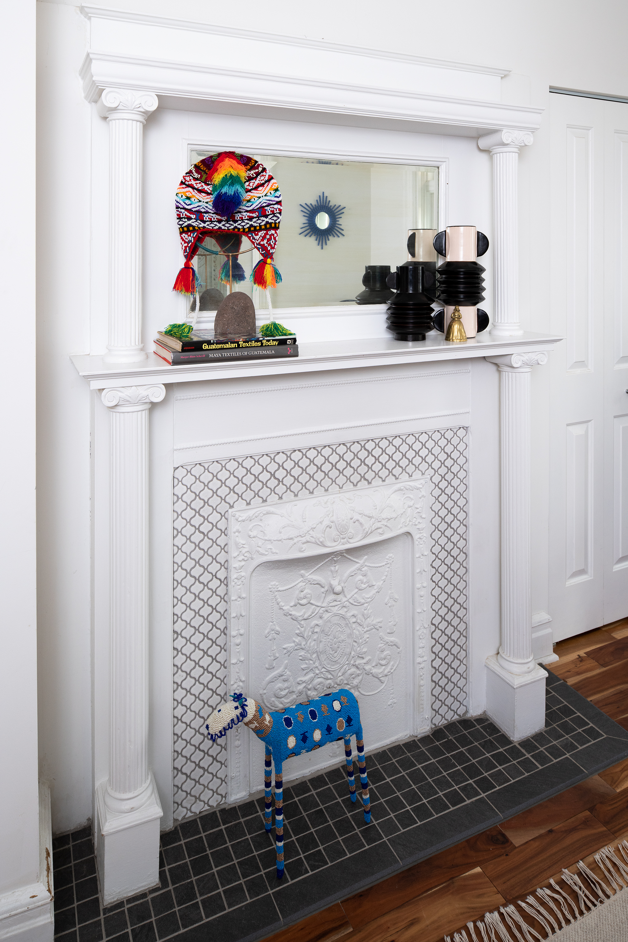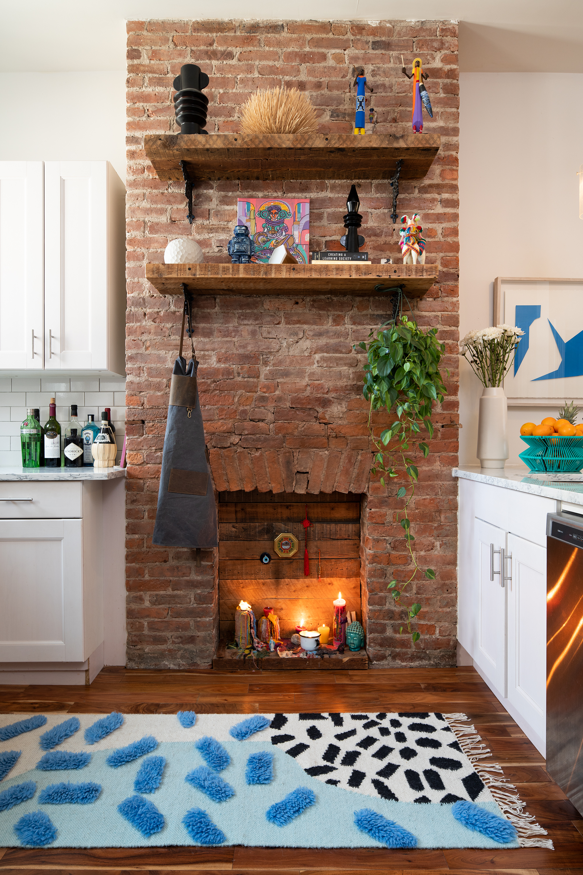 In the crisp white kitchen, freshly renovated by the landlord, souvenirs such as the candombe musicians from Pertile’s native Uruguay peer down from the rustic shelves while the couple prepares comforting hilachas and empanadas. An altar clustered with candles and spiritual symbols occupies the decorative brick fireplace. “It’s a mix of traditions and cultures and beliefs,” Olivero says. “Every time we’re manifesting, a candle [lights] up.”
