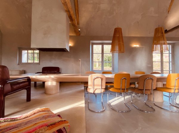 The optimistic citrus textured wall is the highlight of this otherwise spare dining room. Any potential cuteness is thwarted by the linear black notes, which give the space gravitas.