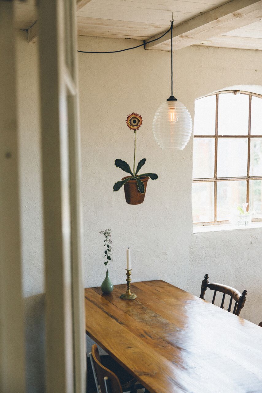 From a strictly aesthetic standpoint, the table-wall combo works wonders in small, rustic settings. In this sweet, Scandi cottage, a simple farmhouse table, textured walls, and antique lighting make for an incredibly cozy vibe. Ultimately, this close-knit set up will encourage all tablemates to engage in conversation and connect.