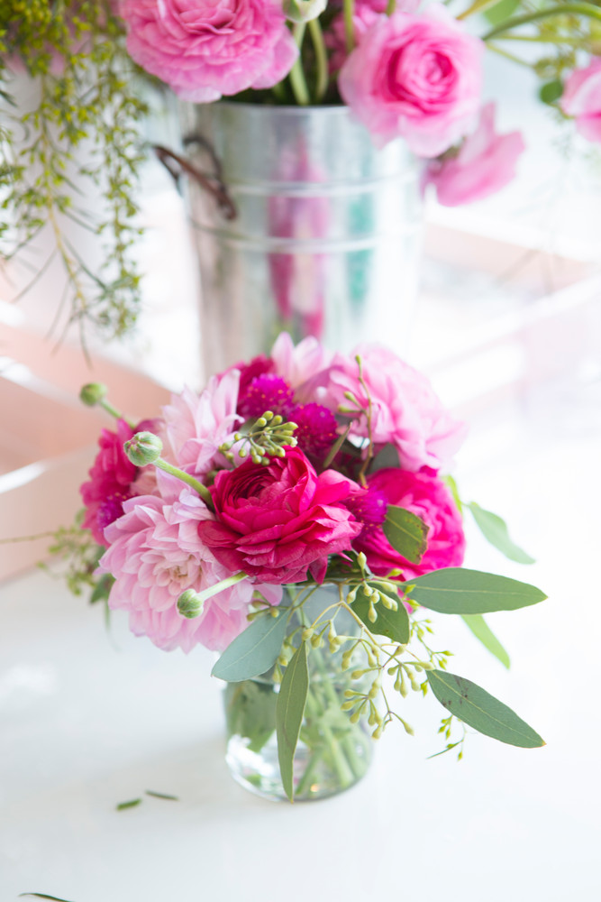Our editorial team loves to play with a single color palette to really optimize a look and make a bold statement, usually that means staying within one color, but using different tones. During the workshop, we opted for an ombre of pink flowers, with a few accents of greenery.