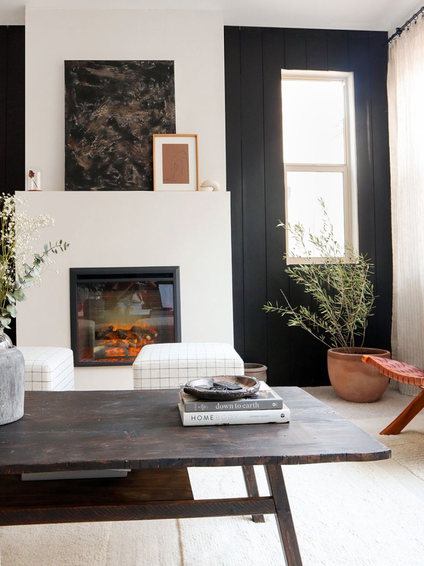 Guerrero had originally installed white horizontal shiplap on the wall where they’d eventually put the fireplace, but later decided to swap it for black vertical planks—and instead of removing the horizontal boards, she added the new ones right on top. To get the fireplace perfectly flush against the wall, she’d have to remove both layers and then reinstall the black version. “I was seriously like: Why did I do this to myself?” says Guerrero. “My best advice would be to always go the extra mile—don’t take the easy way out.”