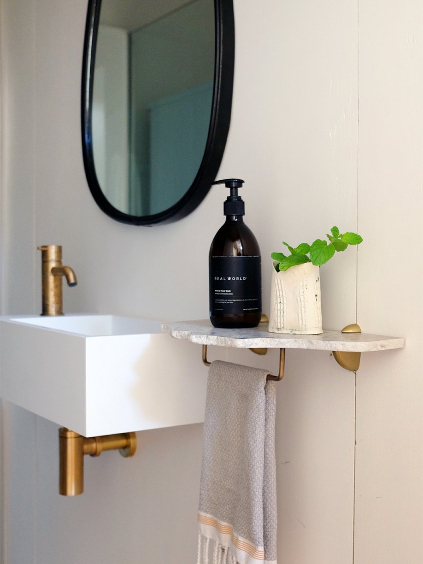 To match her bathroom’s other hardware, Hall turned the originally silver shelf clips (she used Australian brand Flexi) gold with a Rust-Oleum spray paint. Two coats will give you a saturated, metallic sheen.
