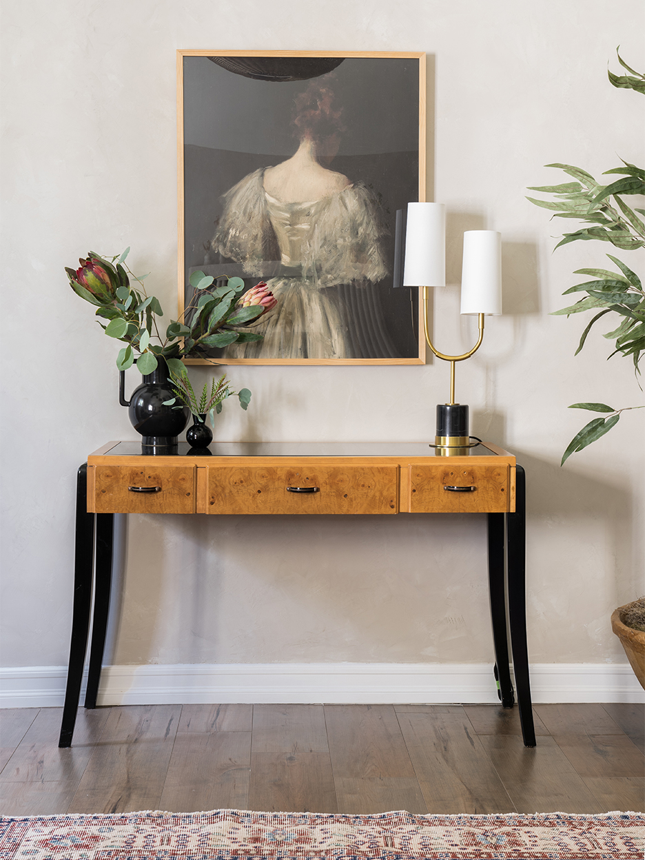 Brownell swapped her old CB2 futon (formerly the guest bed) for a proper mattress that can be folded up into the wall when not in use. The designer purchased a Murphy bed kit from Rockler that comes with all the essential hardware, including the fold-down mechanism and details on how many pieces of particleboard—or in her case, quality walnut plywood—you need to buy to complete the frame. When Brownell got the wood pieces back from her local lumberyard, she spotted an issue: The two boards that would make up the bottom (or the side you see when it’s closed) were two slightly different shades. “The color of wood varies from tree to tree,” she says. “Lesson learned: Make the time to go and pick out your exact pieces of plywood.” The designer added oak dowels to the facade to help disguise the seam down the center.