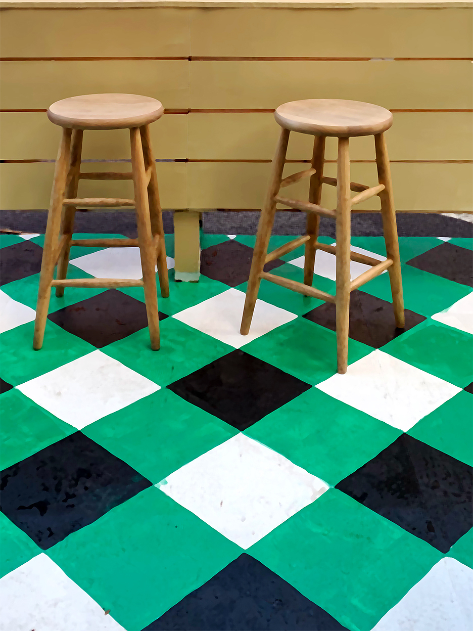 A painted wood floor outside of the Hi Hi Room re-creates the vibe of its interior—and makes a good case for a colorful deck.