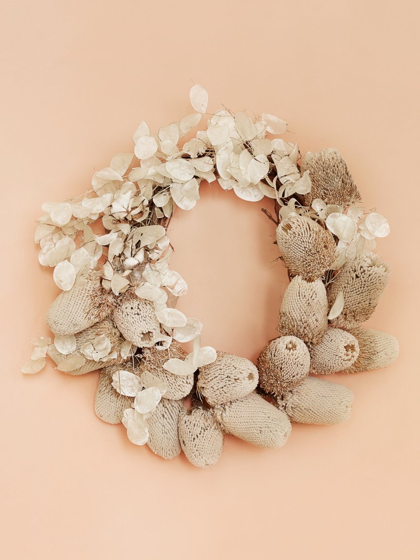 Pine cones are a time-tested way to adorn a wreath, but Taylor Patterson, owner of Fox Fodder Farm, took an outside-the-box approach with banksia, an Australian wildflower known for its spikes and oversize heads. “This unconventional material still feels very holiday to me,” says Patterson. The juxtaposition of the heavy bulbs with the paper-thin leaves gives the monochrome design an extra edge.