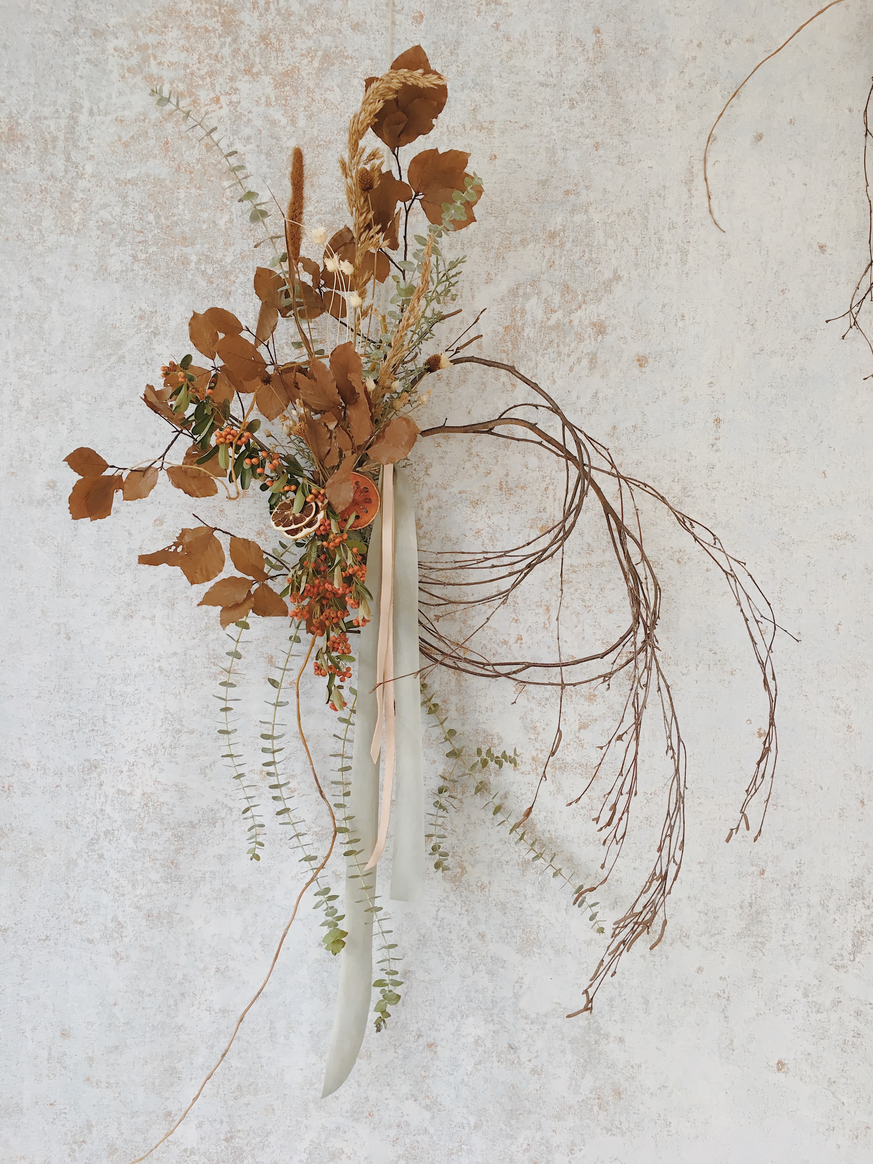 Los Angeles floral designer Kristen Caissie of Moon Canyon decided to go about as un-wreath-like as possible, opting for an uneven composition and a delicate loop of Victorian birch branches for the frame. She went full force in just one corner, packing in found fall foliage and dried fruits—an homage to the season’s harvest.