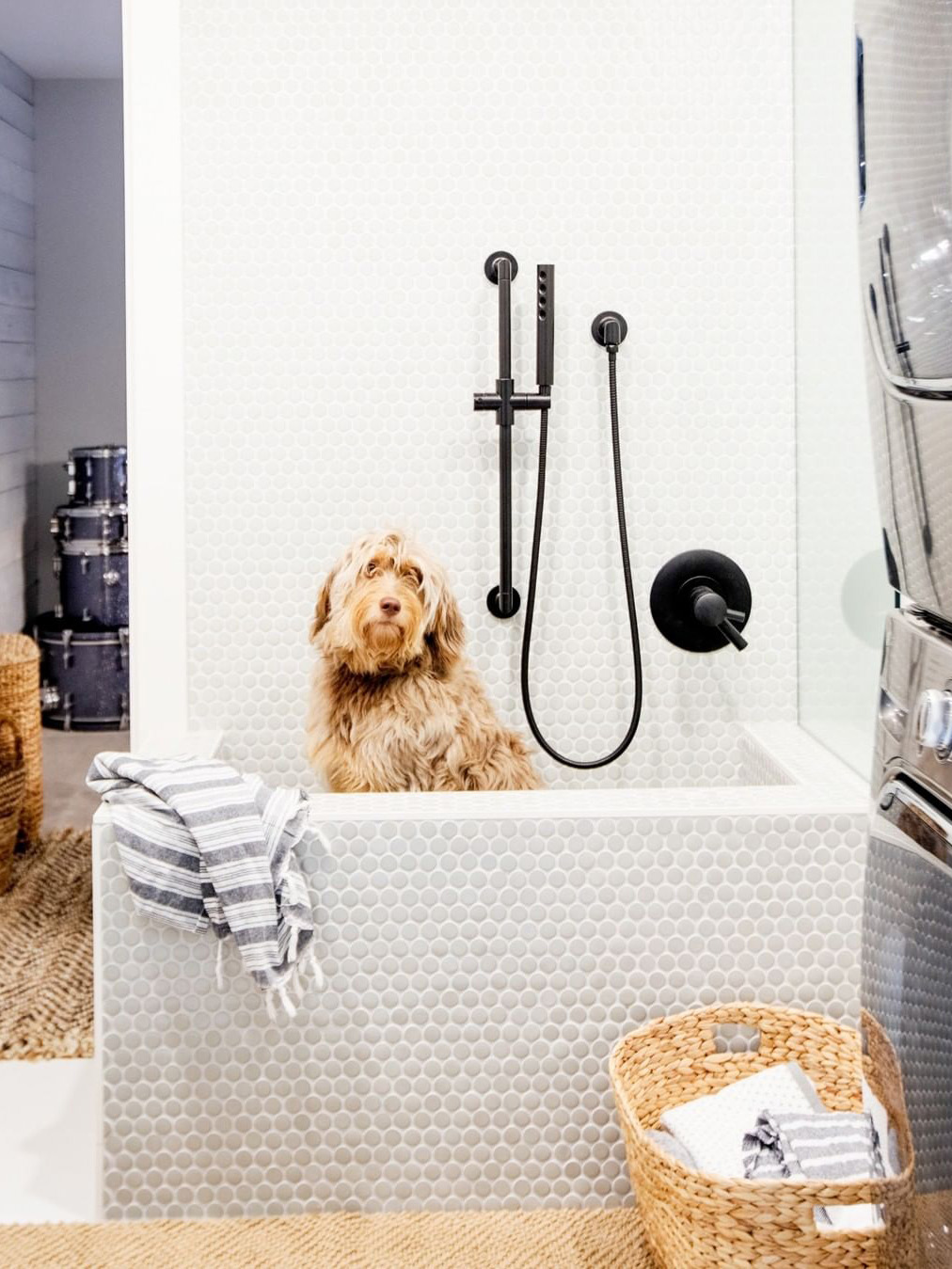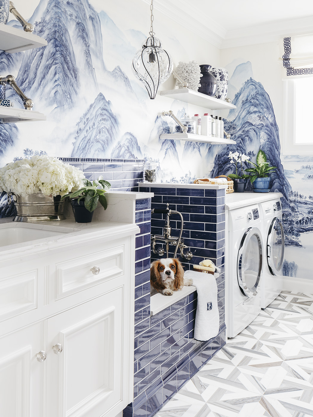 It takes time to get your pup squeaky-clean, so make the room one you want to be in. Dina Bandman’s soothing example revolves around de Gournay’s hand-painted A Thousand Li of Rivers and Mountains wallpaper (the Delft-inspired colorway led to the glossy navy 2-by-8 bath tiles from Country Floors). The bathing zone was designed for ease: You can sit on the wide ledge while holding your dog with one hand and hosing her down with the other.