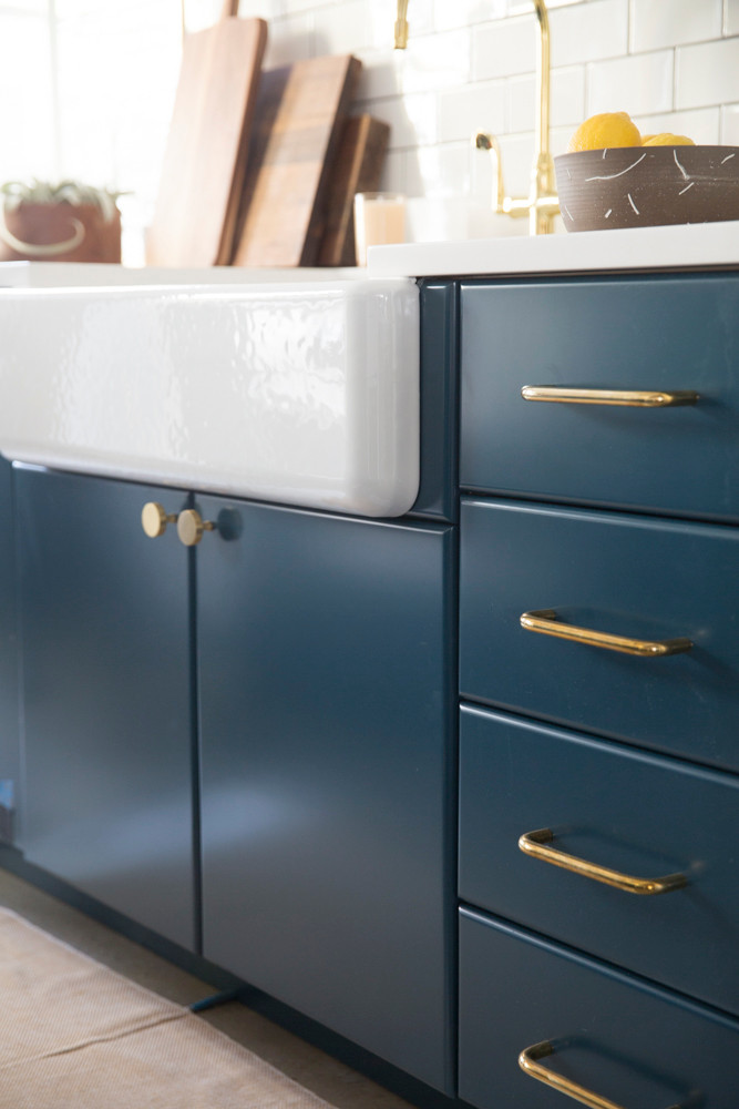 A classic white subway tile with dark grey grout, by Crossville, would set the backsplash for the modern kitchen, decked with lustrous brass accents, such as these gorgeous sconces by Schoolhouse Electric & Supply Co. The cabinets are a show-stopper, imparting a bold accent that would define the kitchen.