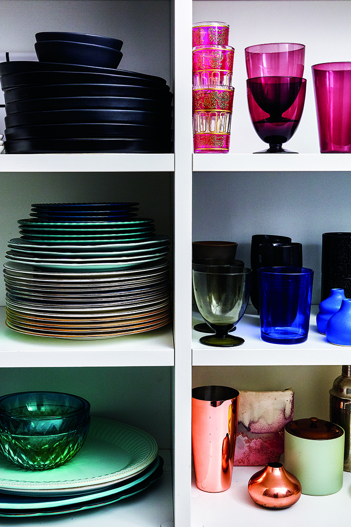 Tucked around a corner, the prop closet keeps dishware for styling food and entertaining stories at the ready. Using helpful organizational techniques—such as sorting items by color—we were able to make the most of the relatively small amount of space allotted for our ever-growing collection of plates, textiles, and even a handful of bigger ticket furnishings. Taking care of business never looked so good.