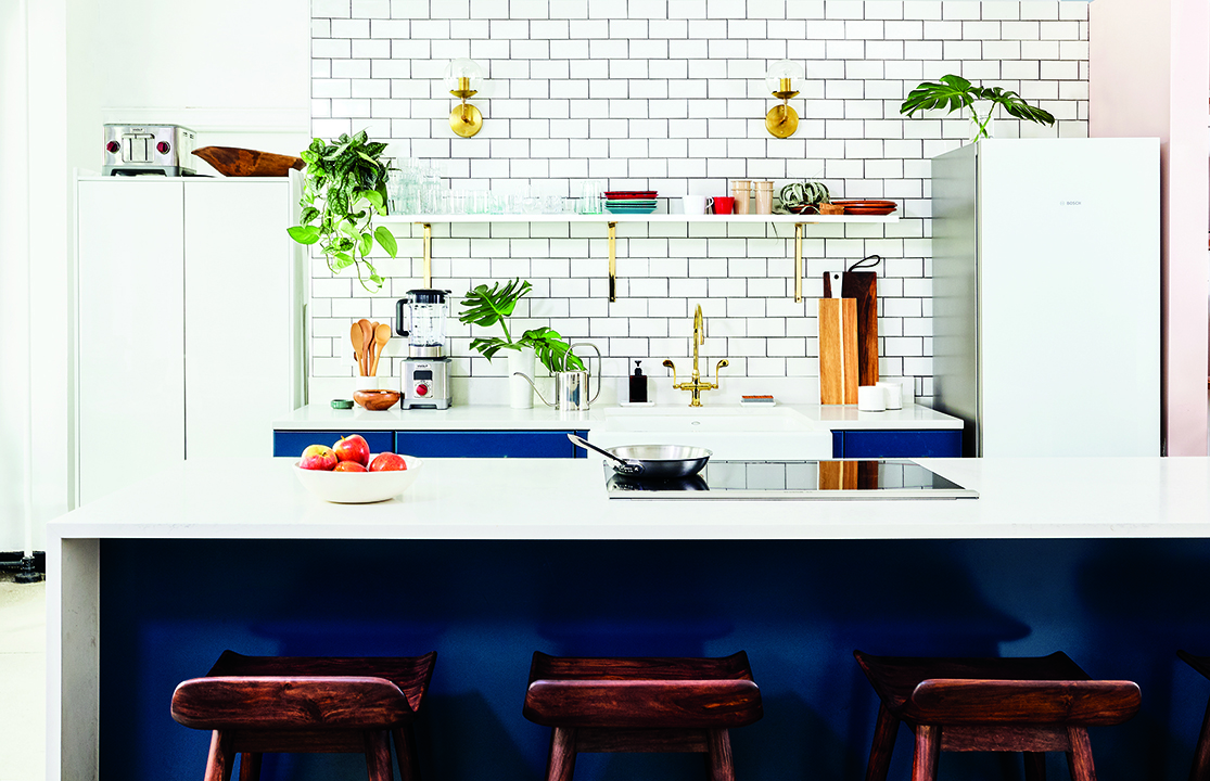 Serving as the frequent photo studio and a gathering spot for lunch, our light-filled kitchen—in calming blue and simple-yet-forever-chic white subway tile is arguably the hub of the office. (Ask anyone on team Domino, and you’ll find a collective obsession with said dynamic shade of blue). Its close proximity to a fully stocked bar cart also helps.