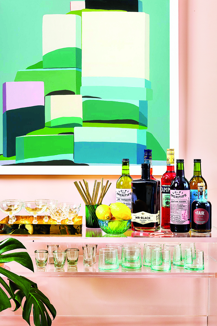 Who said you had to use a bar cart for a bar cart? Here, an acrylic console meant for the entry doubles as a libation station, stocked to the nines with our go-to spirits and sleek glassware to match.