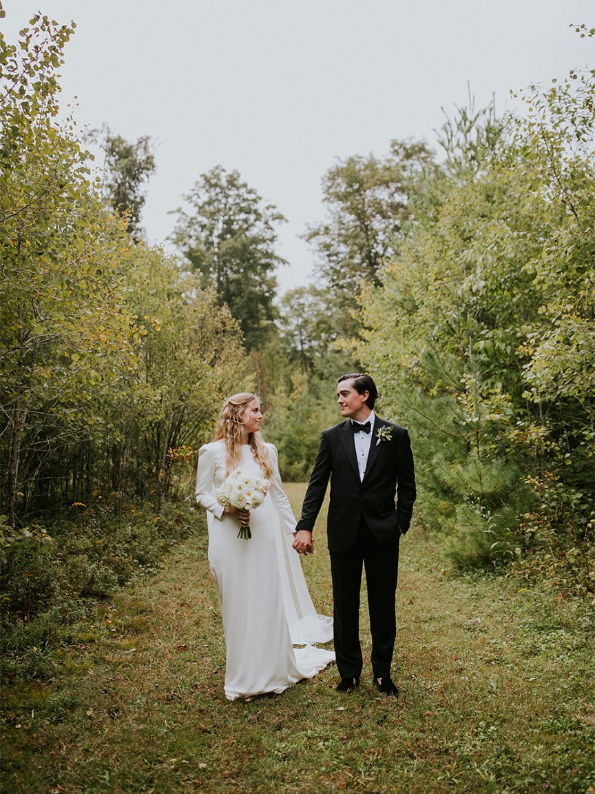 The pair, who met their first week at Vanderbilt University in Nashville, set the meaningful tone with a save-the-date card that Helen watercolored with a design that nods to their wedding date’s full moon. The invites featured more of Helen’s artwork, and gave all the details: On September 14, 2019, 215 of their family and friends would gather for a black-tie wedding at Marble House Project, an artist residency in Dorset, Vermont.