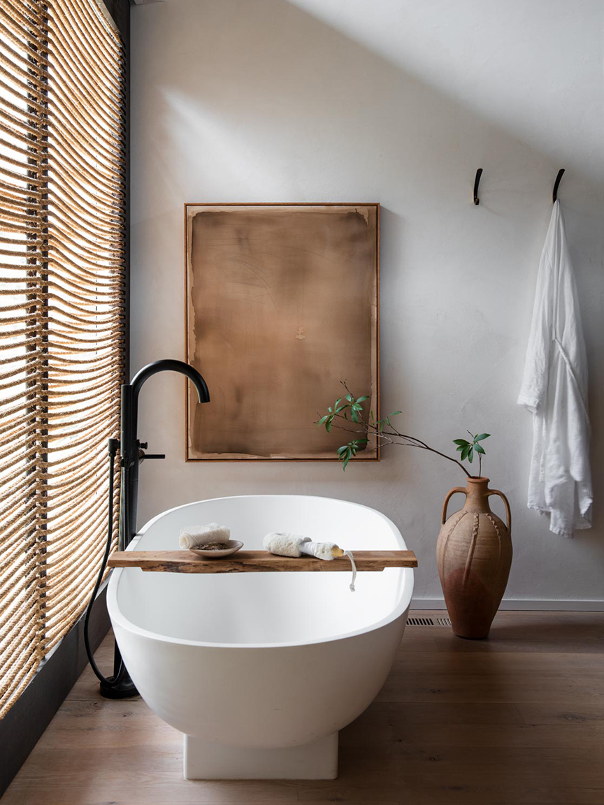 A bathroom that promotes peace and quiet might just allow hardworking Capricorns to finally take a break. Athena Calderone’s space, complete with a freestanding tub and large clay vase, has major hotel vibes. If you must bring the office with you, there’s room for that too in the form of a wood tub caddy to prop a laptop (be careful!) or papers to look over.