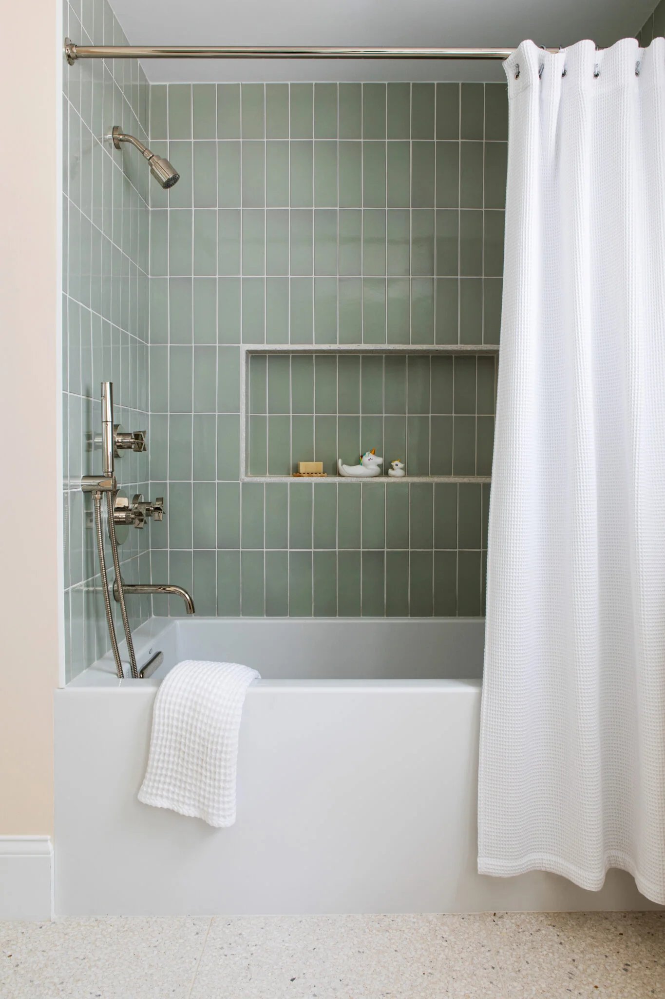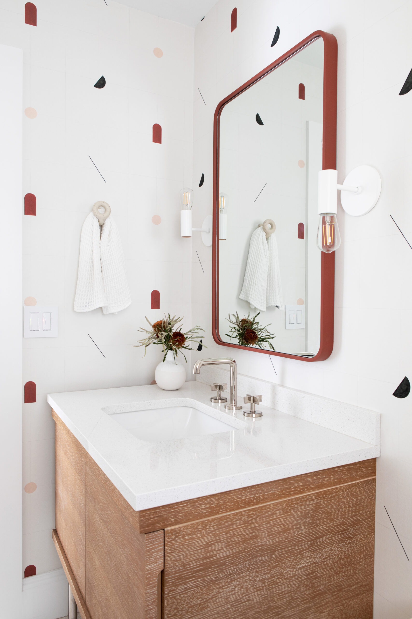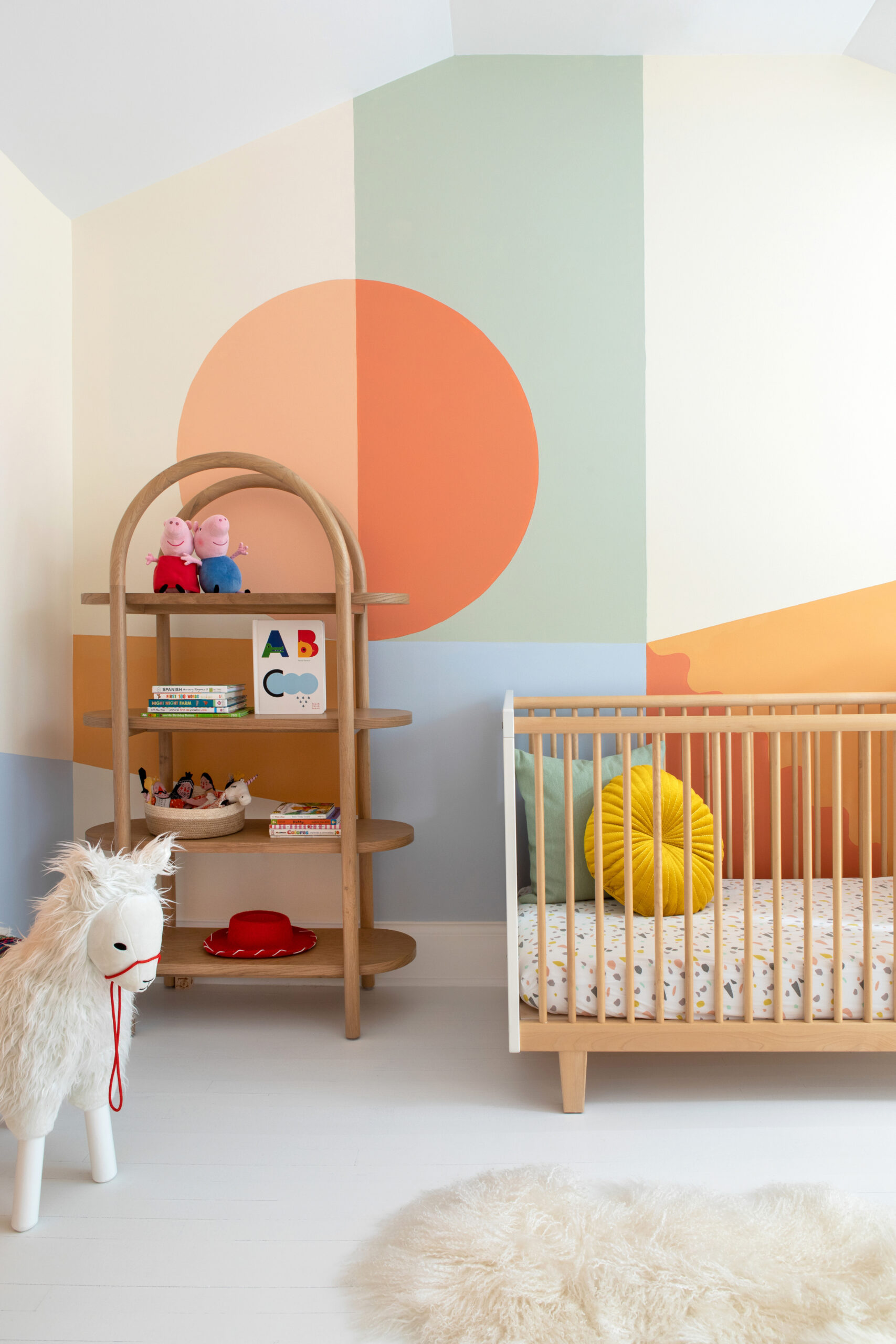 It was a no-brainer to give Lola, already a social butterfly, the biggest bedroom in the house. “We thought, she’s going to end up having tons of friends over for sleepovers when she’s older, so let’s give her this space,” says Simonpietri. Until that day, the extra square footage is great for post-bath-time family dance parties, made all the more fun by the boldly colored shapes on all the walls (artist Tiffany Lusteg flew out from California to paint the mural). The queen-size bed by the windows doubles as spillover space when guests come to visit, and it takes the place of traditional poufs that might otherwise be a tripping hazard for a toddler.