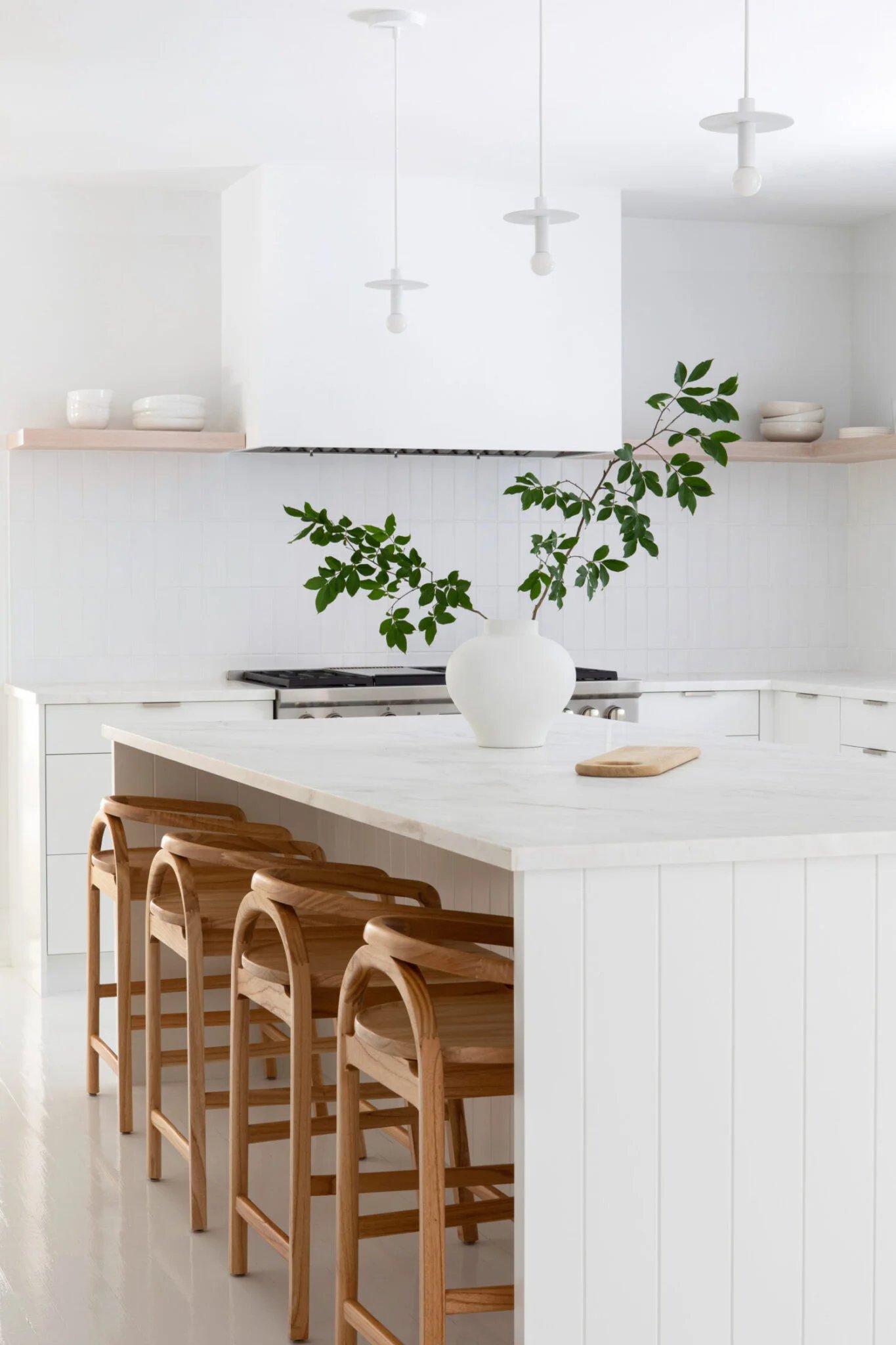 “When I want a white to really read as white, I go with something that doesn’t have any cream in it,” she explains. “Potentially I even go for a very faint gray-blue.” After a good sanding, the floors were coated in the brand’s ArmorSeal Rexthane, a high-gloss product that can stand up to sandy feet and scuffs much longer than a standard interior paint (it’s equivalent to two-part urethane coatings).
