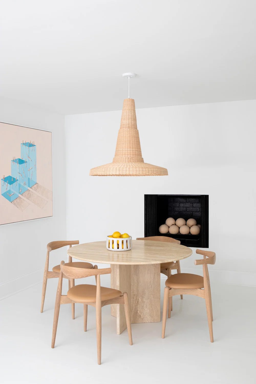 While the home’s footprint might be large, its low ceilings mean the amount of natural light streaming in is limited. “Very quickly we decided we were going to paint the entire thing white,” says Simonpietri (well, at least the shared spaces downstairs). Her swatch of choice? Sherwin-Williams’s Extra White in a flat finish (the crispest shade she could find).