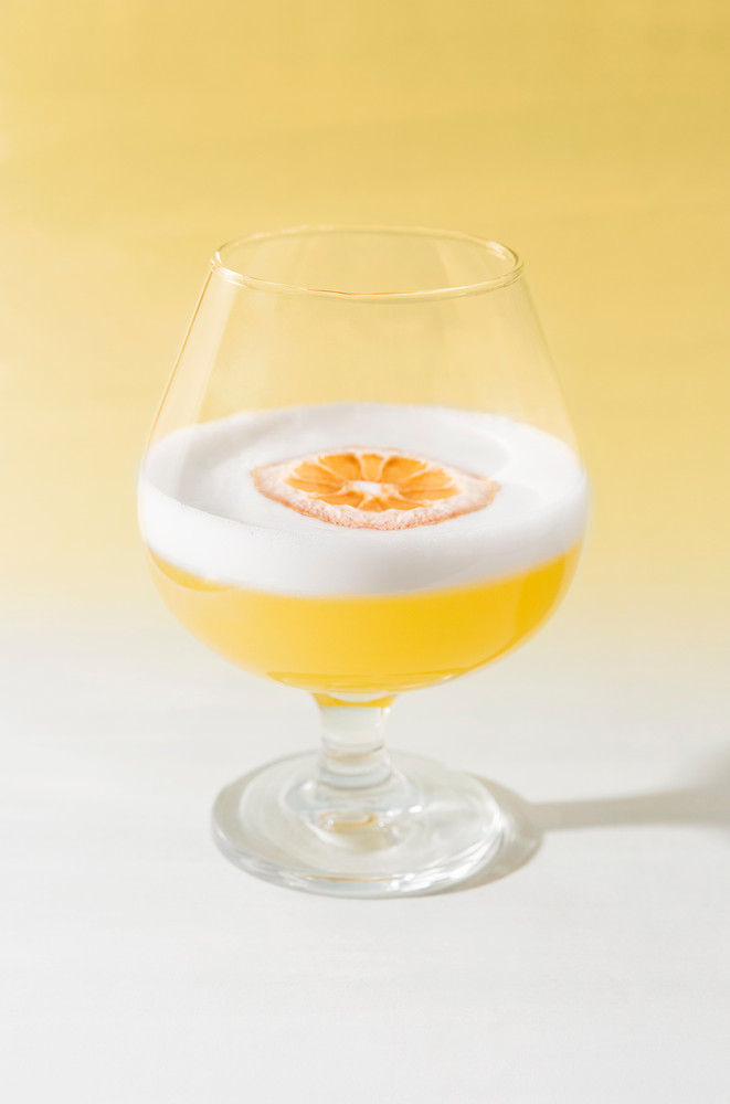 Dry Shake, then Shake with ice, fine strain into a snifter glass with no ice. Garnish with a dehydrated lemon wheel.