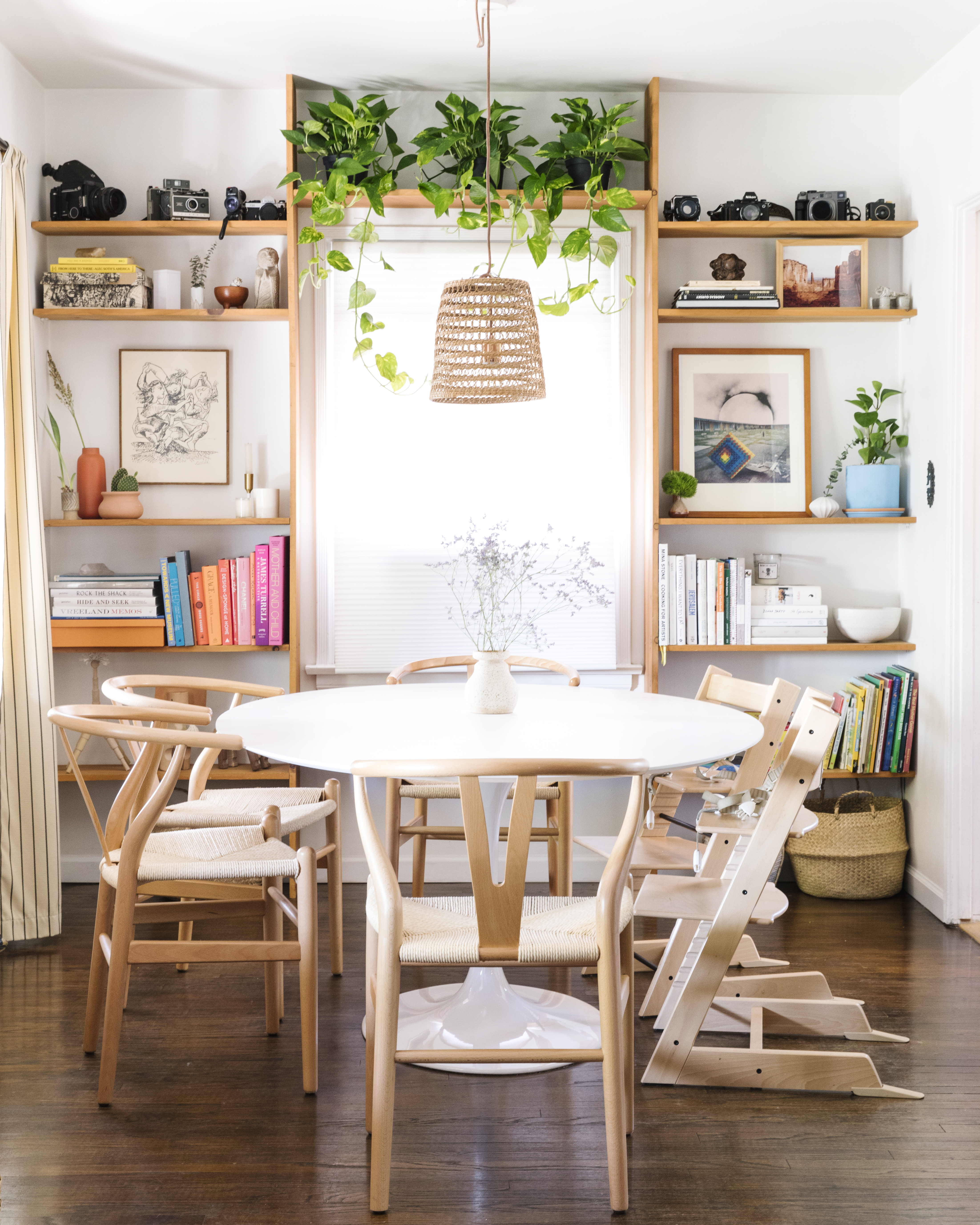 The dining room’s light and airy feel can be attributed to the seemingly pared-down decorative aesthetic that’s more in line with Bellis’s preferences. The white walls serve as a canvas of sorts, providing a high-contrast backdrop for the cluster of greens that immediately pop. The packed built-in shelves naturally fold into the room’s design, courtesy of the light wood finishes emulated by way of the furnishings.
