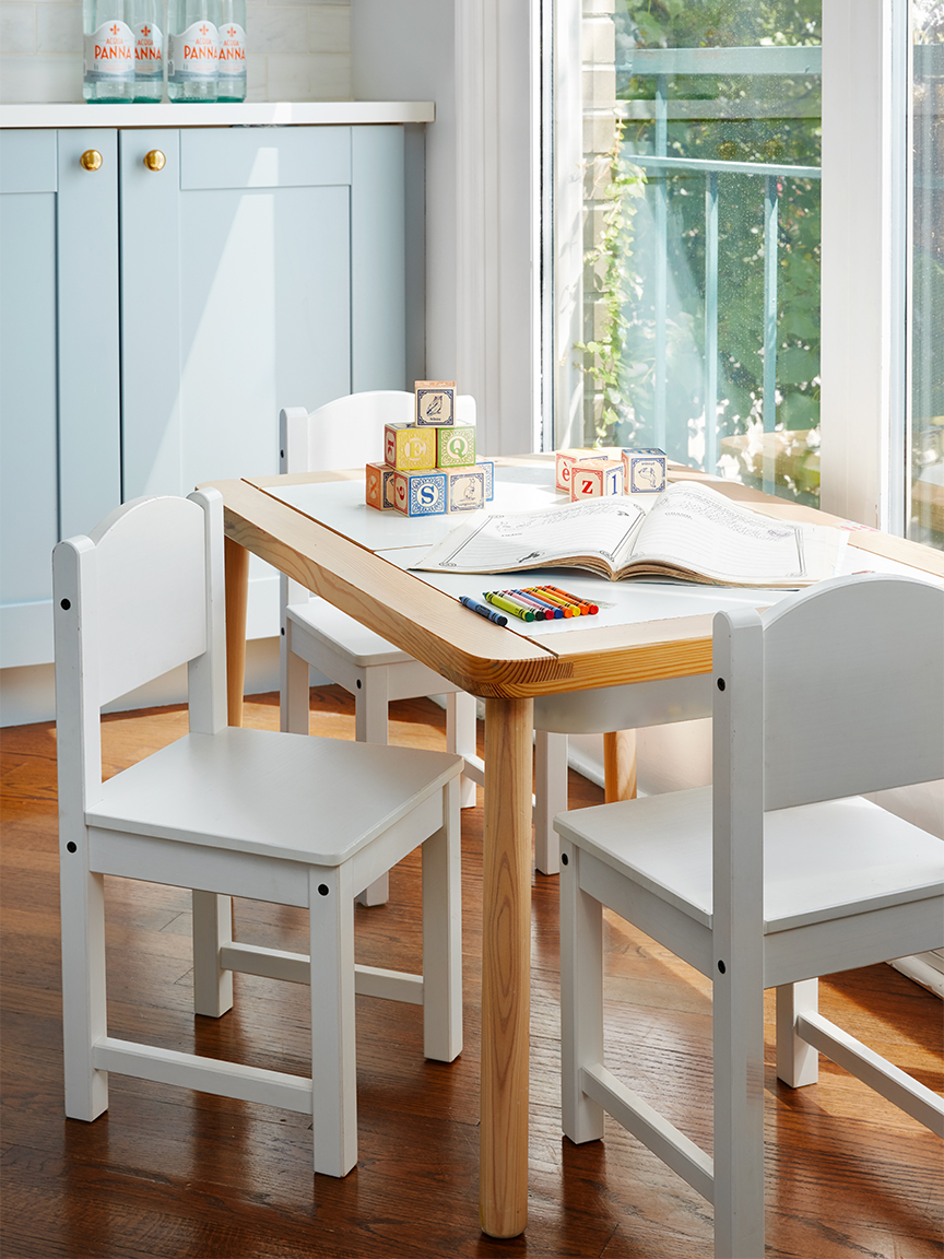 What Stamos really dreamed of was Calacatta Gold marble on every surface—a signature style she turns to in many client projects. But because she had a limited budget and toddlers at home, she knocked a few additional thousands off the budget by opting for durable quartz countertops by MSI Stone instead. “They can take a beating and be cleaned up easily,” she says. Still, her heart was set on natural stone somewhere, so Stamos elevated the backsplash with Dolomite marble tiles from Daltile, which offer a similar style to Carrara without the high price tag.