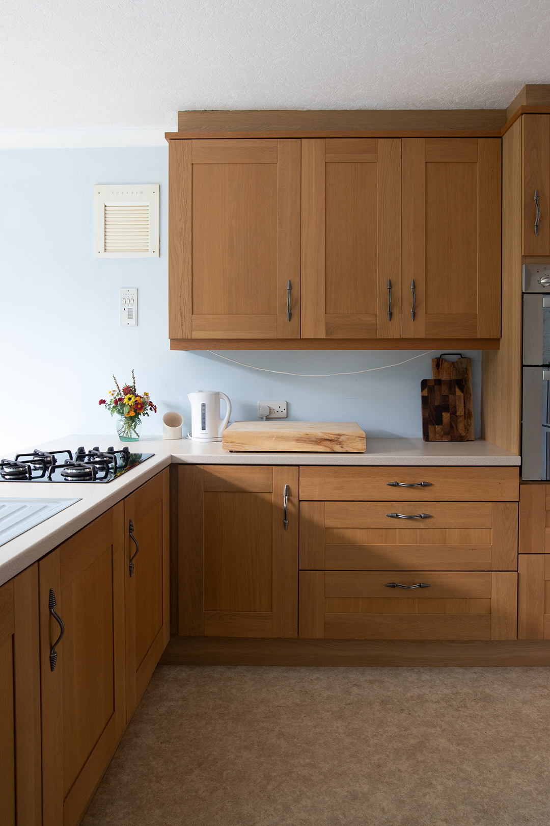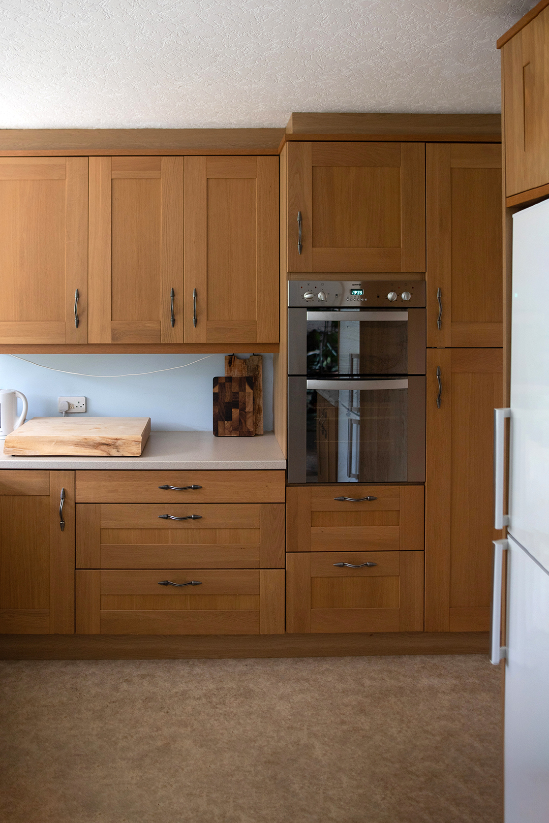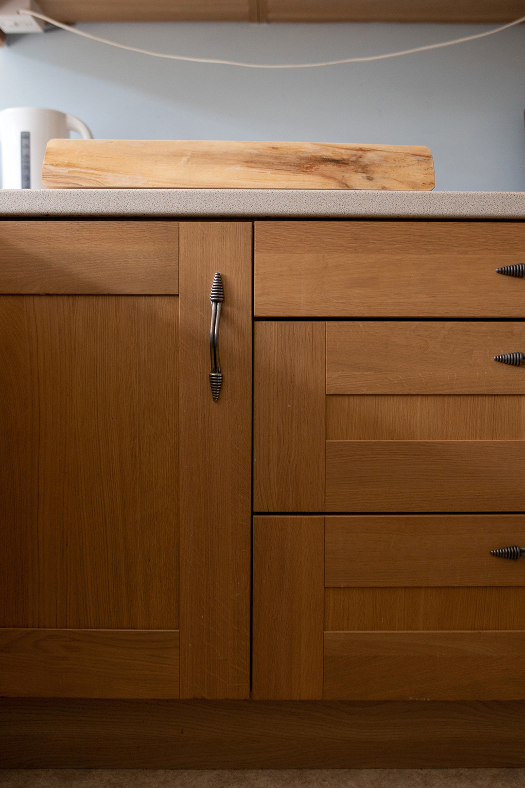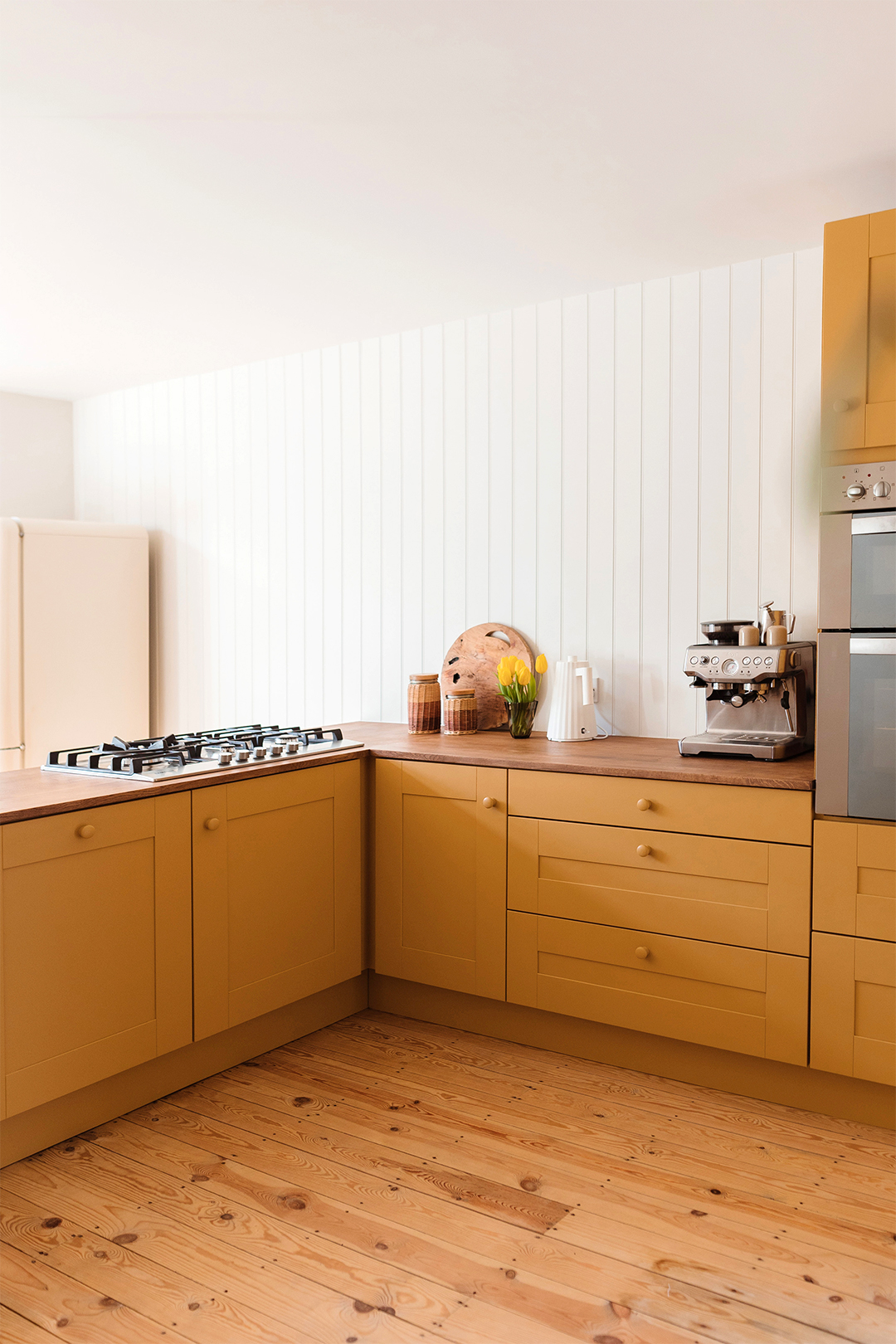 A deep sanding and an acacia wood stain were all it took to restore the planks to their former glory. Lathan used the same finish (her go-to due to its warm but not too yellow finish) on the $980 oak butcher block counters as well.