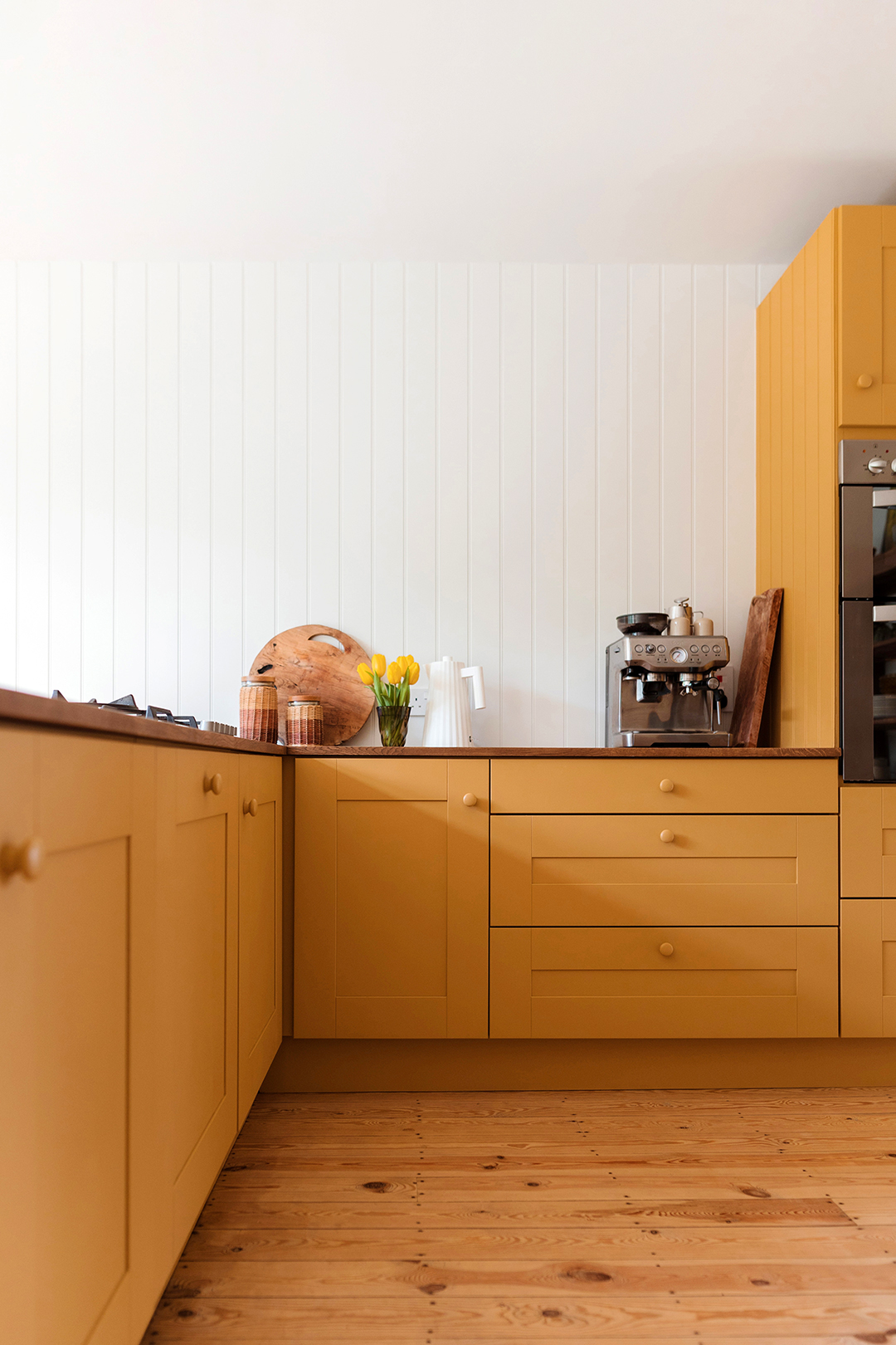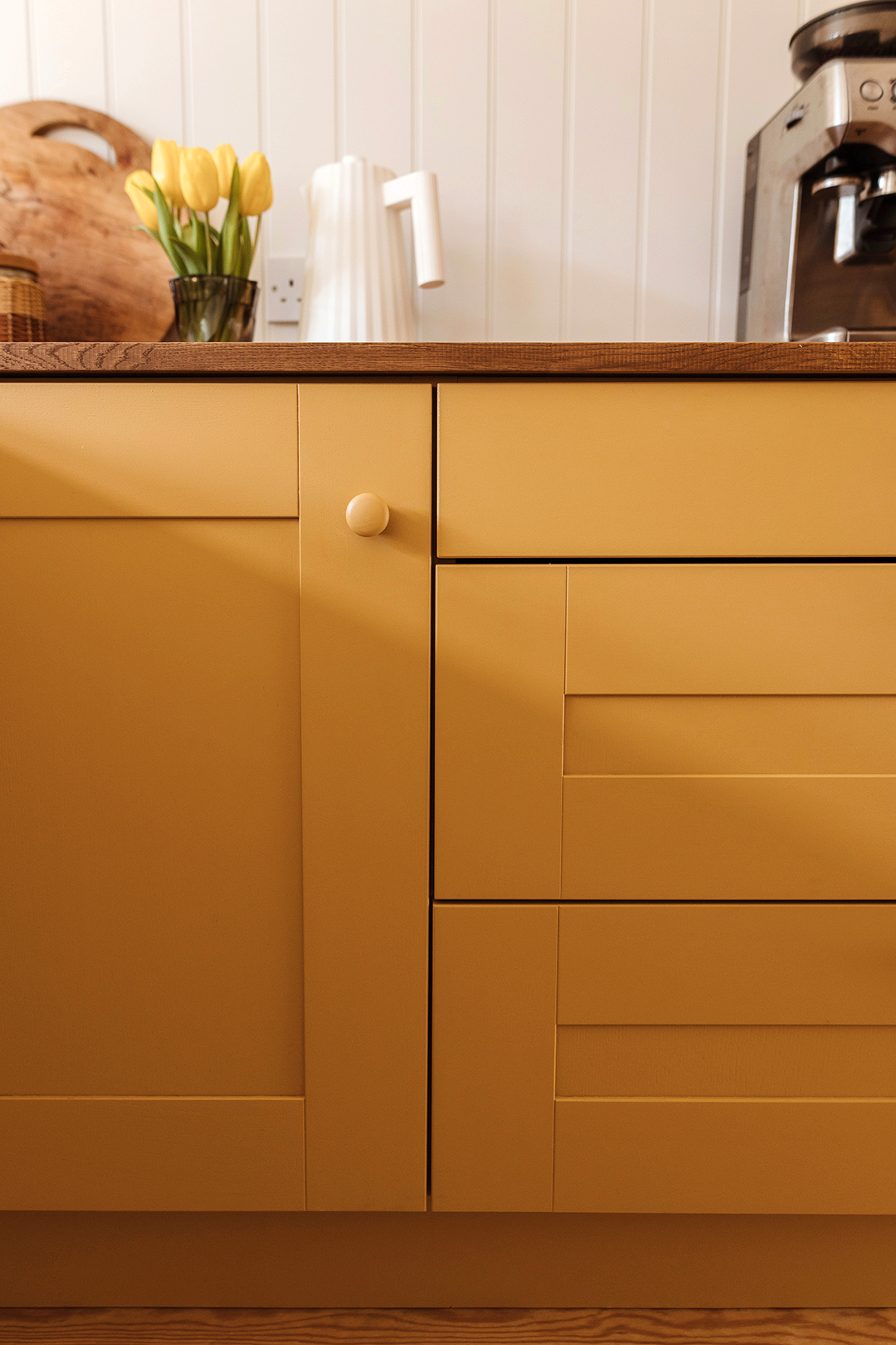 However, it wasn’t worth it to Lathan to tear out the rest just to replace the units with IKEA boxes. “All of the frames were still incredible quality,” she says. Here, a $50 gallon of paint was the quick (and cheap) answer. Torn between marigold and sage, Lathan went with her gut and embraced the bungalow’s groovy past with a mustard coat on everything, including the new budget-friendly drawer pulls ($12 for a pack of 20). Golden hour, but make it all day long.