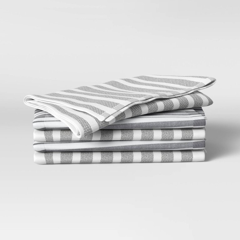 I have a pileup of, like, 20 dish towels, and they are all stained and ruined. So I do not buy expensive dish towels anymore; I let them be what they’re going to be, because I try not to use paper towels. I just pick them up whenever I’m at Target.