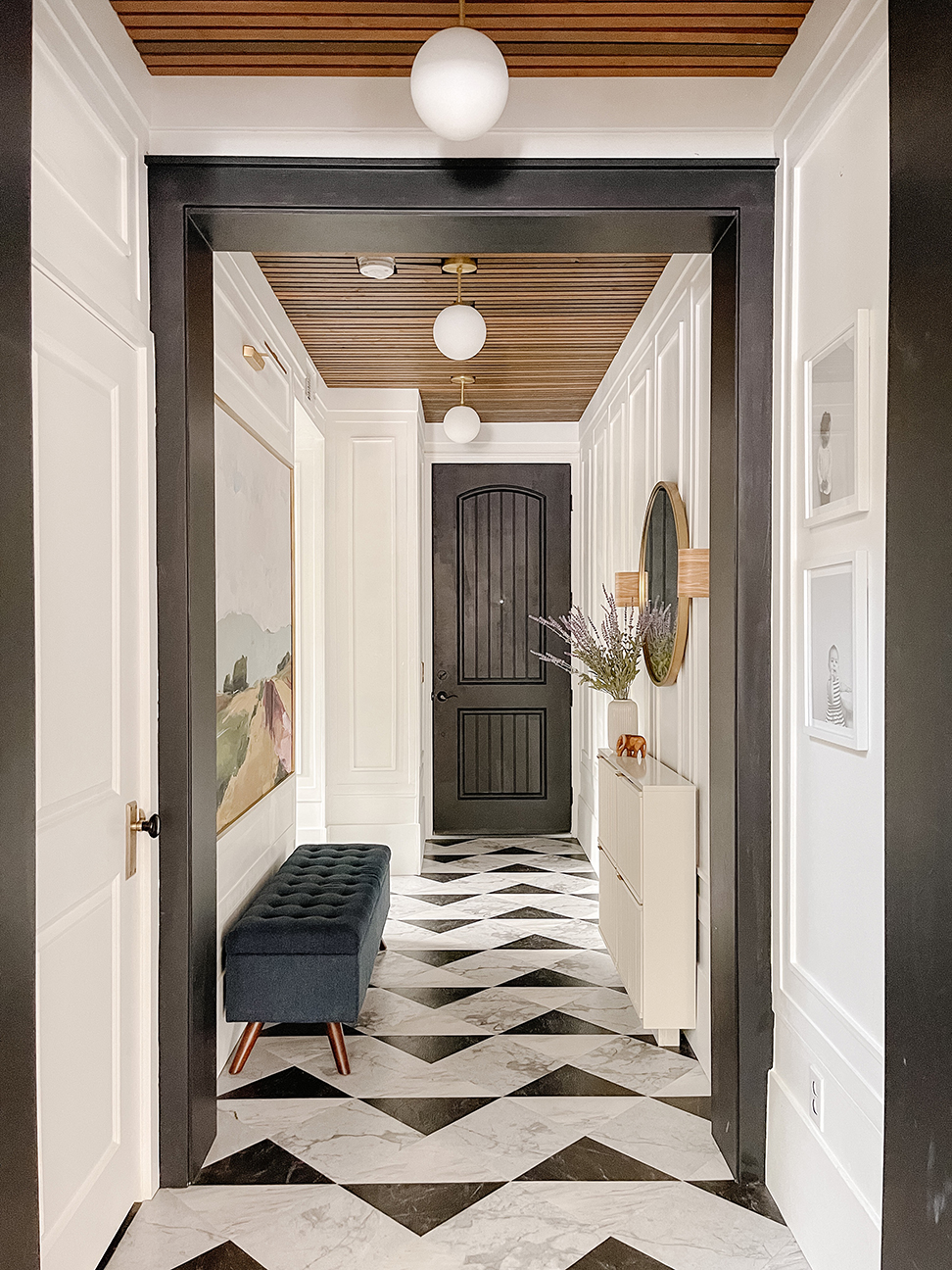 Camille Kurtz never got that welcome home feeling when she walked through her front door. The 12-foot-long entryway in the San Marcos, California, house she and her husband and their two toddler daughters moved into in 2019 was the definition of builder grade. But worse than the blah gray walls and jarring recessed lights was the fact that there were no windows in the hallway (the garage is on one side; a guest bedroom on the other). “Which is why I wanted it to be the first place we tackled,” says Kurtz, who captured every step of the renovation in her blog, The Kurtz Home, as a part of the One Room Challenge. “There was no natural light in there; it was crazy.”