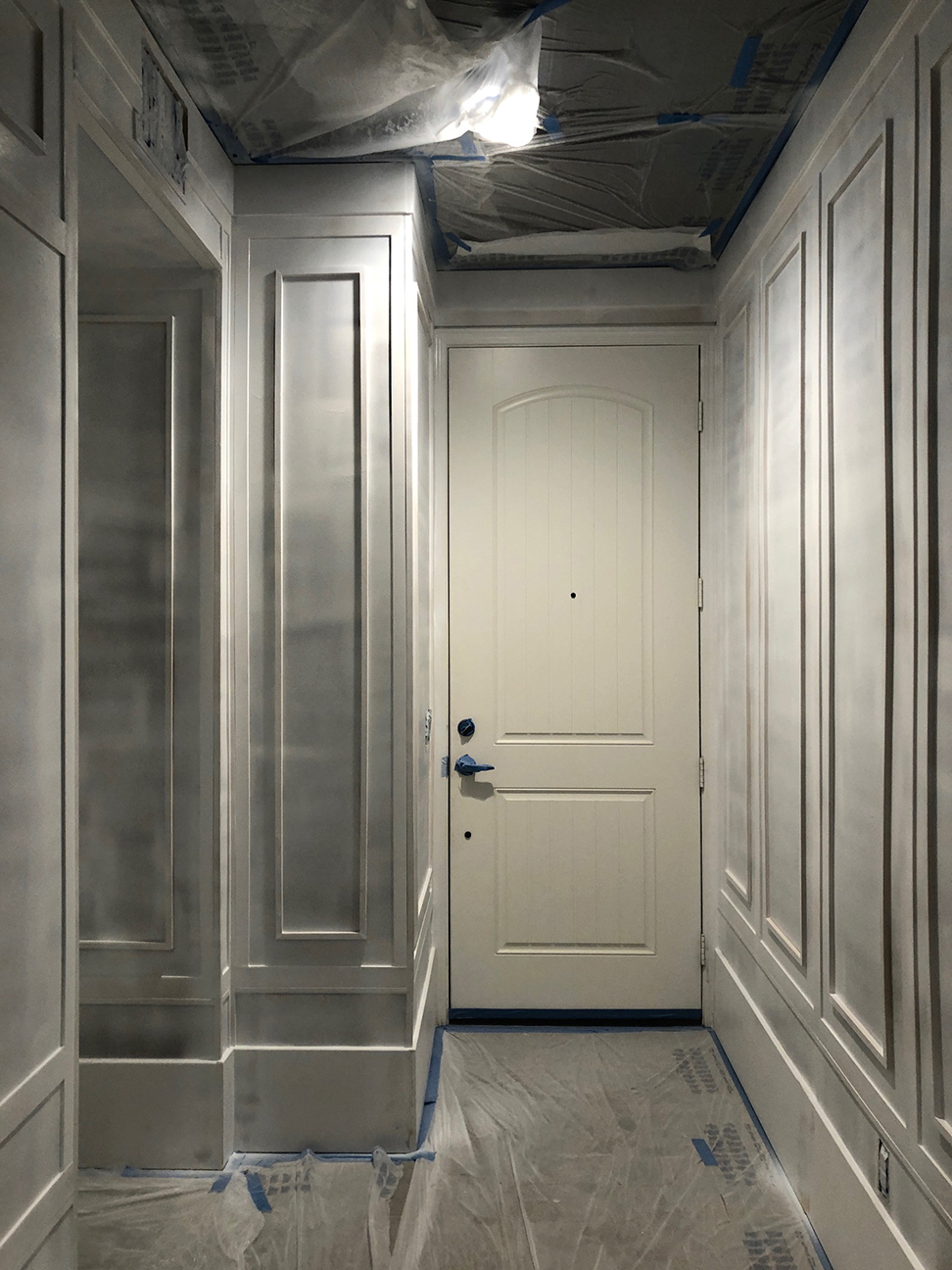 Kurtz knew that bright white paint was the antidote to the sad gray vibes. To achieve the smoothest finish, she invested in a spray gun (it also helps the job go faster—you just have to suit and mask up first). She applied one coat of primer and three coats of Sherwin-Williams’s Highly Reflective White in a satin finish (each session took about an hour and a half, and she set her tool on the 3.5 and the 5 settings for the inside of the corners of all the picture boxes).