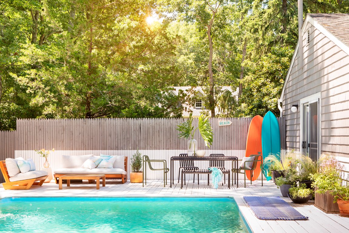 But before they could start hosting, the blah pool area, surrounded by a plain wood fence, would need a makeover. “We were trying to figure out a way to make the outside look nice without spending too much money,” says Campanaro. So they grabbed a can of Benjamin Moore’s Super White paint and started on coating the pool deck.