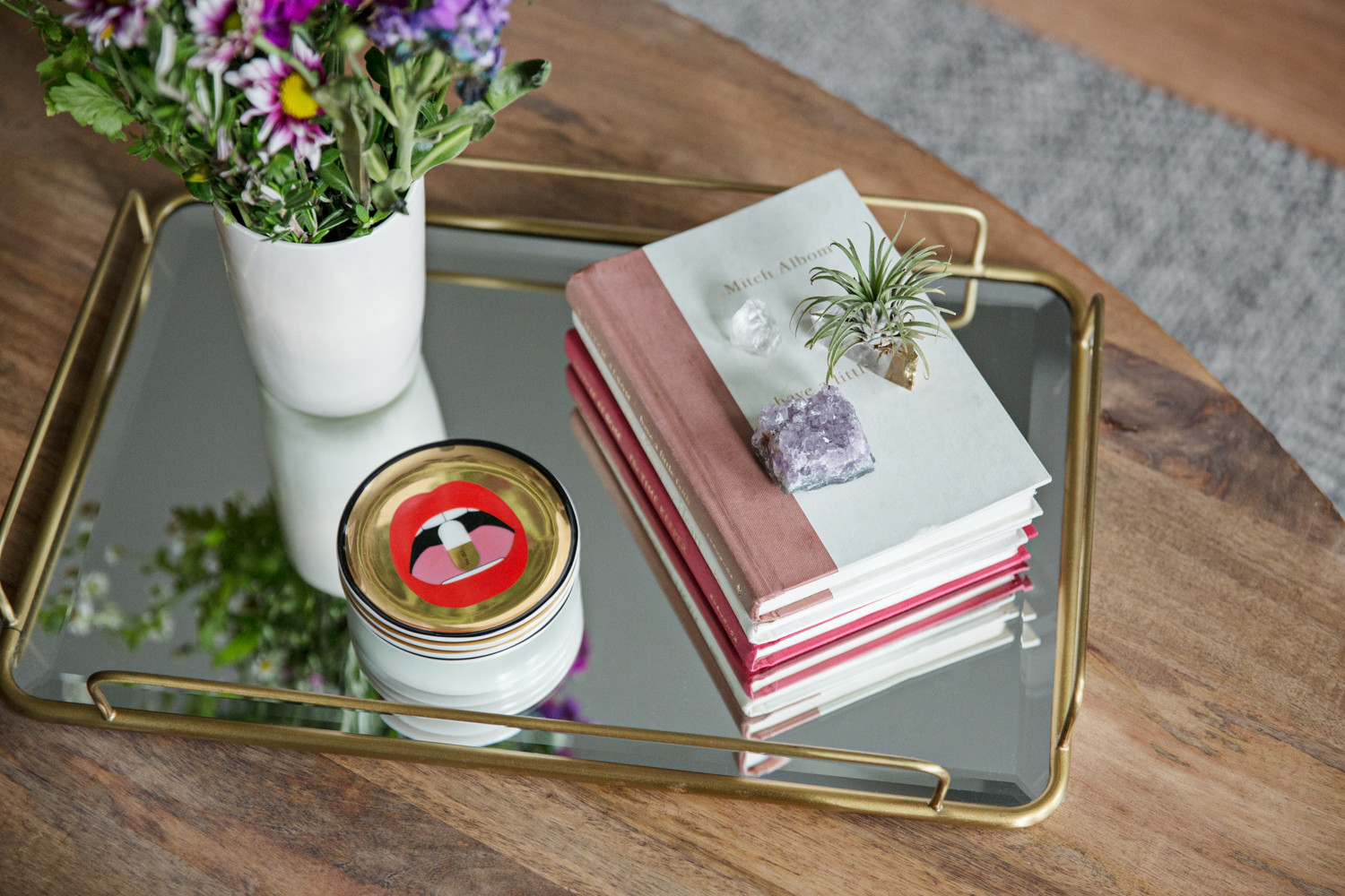 “Ryan and I are super spiritual, so we always like to have the right crystals around,” Isom Johnson says. Amethyst, for example, sparkles on the coffee table because it’s “good for conversation-starting and flow,” she explains. “We host a lot of parties, so we want to make sure that if we’re in here, the conversation is flowing. It’s good energy; it’s good vibes.”