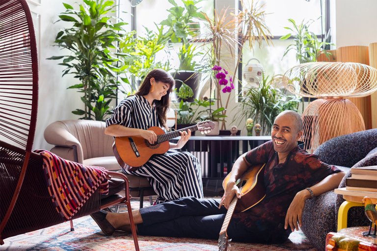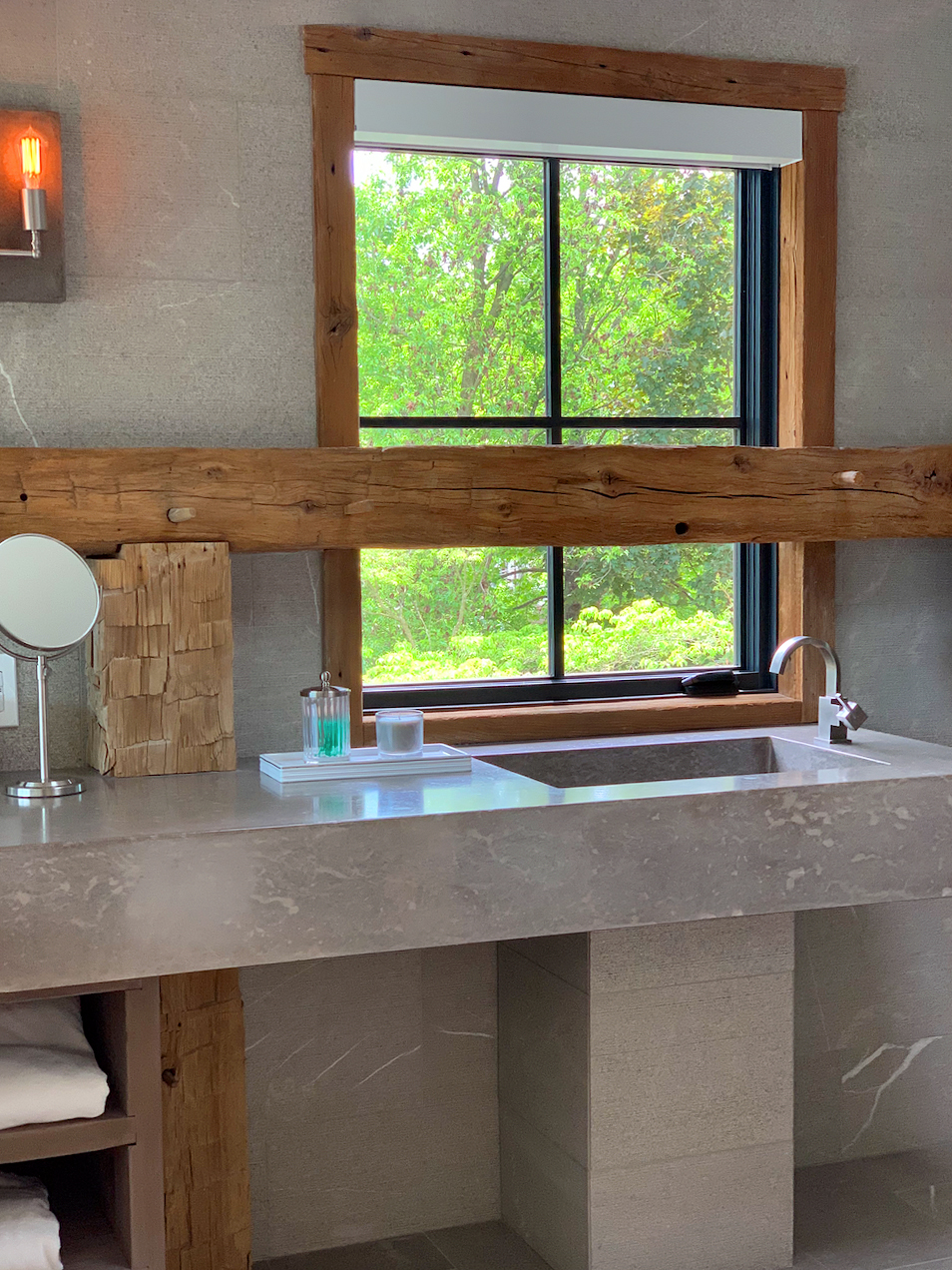 To let in the rays, King had to do the unthinkable: install a window directly behind the room’s horizontal structural beam, lining it up to the kitchen exterior window, one floor below. To make the most of the light now pouring in, she ditched the idea of a traditional mirror above the sink. Anyone washing up can instead enjoy the view overlooking the rushing water. Adding a few Shaker pegs to the post ensures the design decision feels intentional, plus there’s space to hang a towel or loofah, and any small toiletries can be kept on the ledge, freeing the custom concrete countertop of clutter. To preserve its original state, the wood was left unvarnished. The only treatment it received was a thorough wire brushing to get rid of any debris.