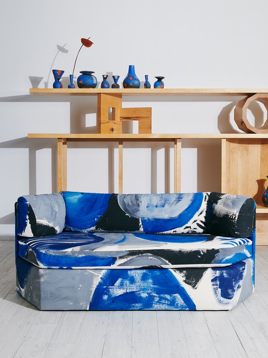 “Once it gets cut up, it’s hard to tell how expansive the piece is,” says Clark. After two months of on-and-off painting, she passed the material off to her trusty upholsterers, who used the abstract textile to cover a three-piece sectional. The sofa is currently on display (and for sale!) in artist-run design studio Fort Makers’s inaugural exhibition, “The Blue Room,” which pays homage to Yves Klein’s statement hue with ultramarine ceramics, cobalt jewelry, and other appropriately colored goods.