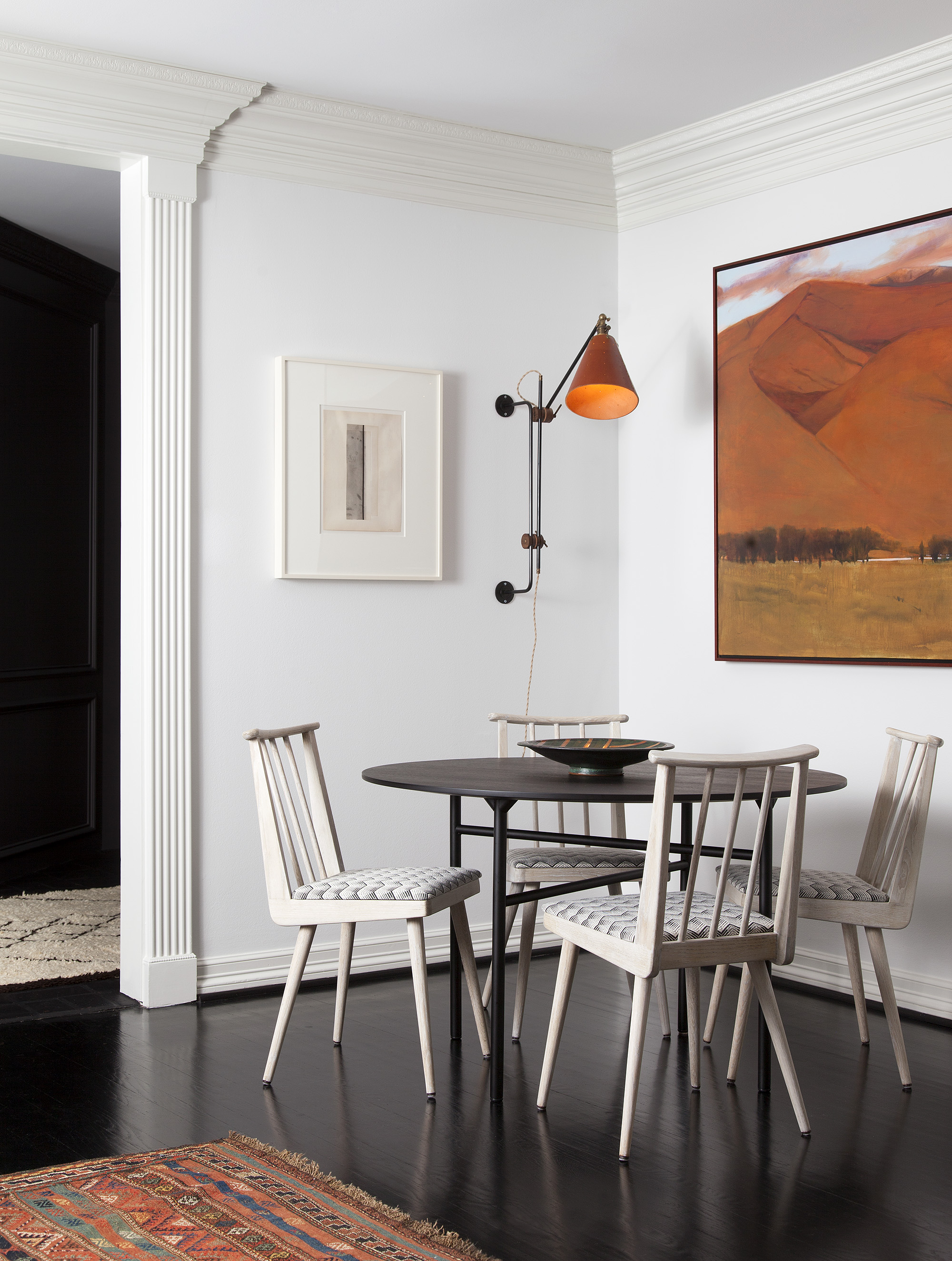 Pitch-black flooring is a divisive topic—just ask any designer or homeowner. Some embrace the dramatic, glossy black look, while others decry the constant marks and grim vibes. “Initially, we weren’t thrilled about the dark floors throughout the house, which felt a bit old and heavy,” says MacPhail. “However, none of us wanted to cut into the renovation budget or make the wasteful decision to replace perfectly good floors because of a color choice.”