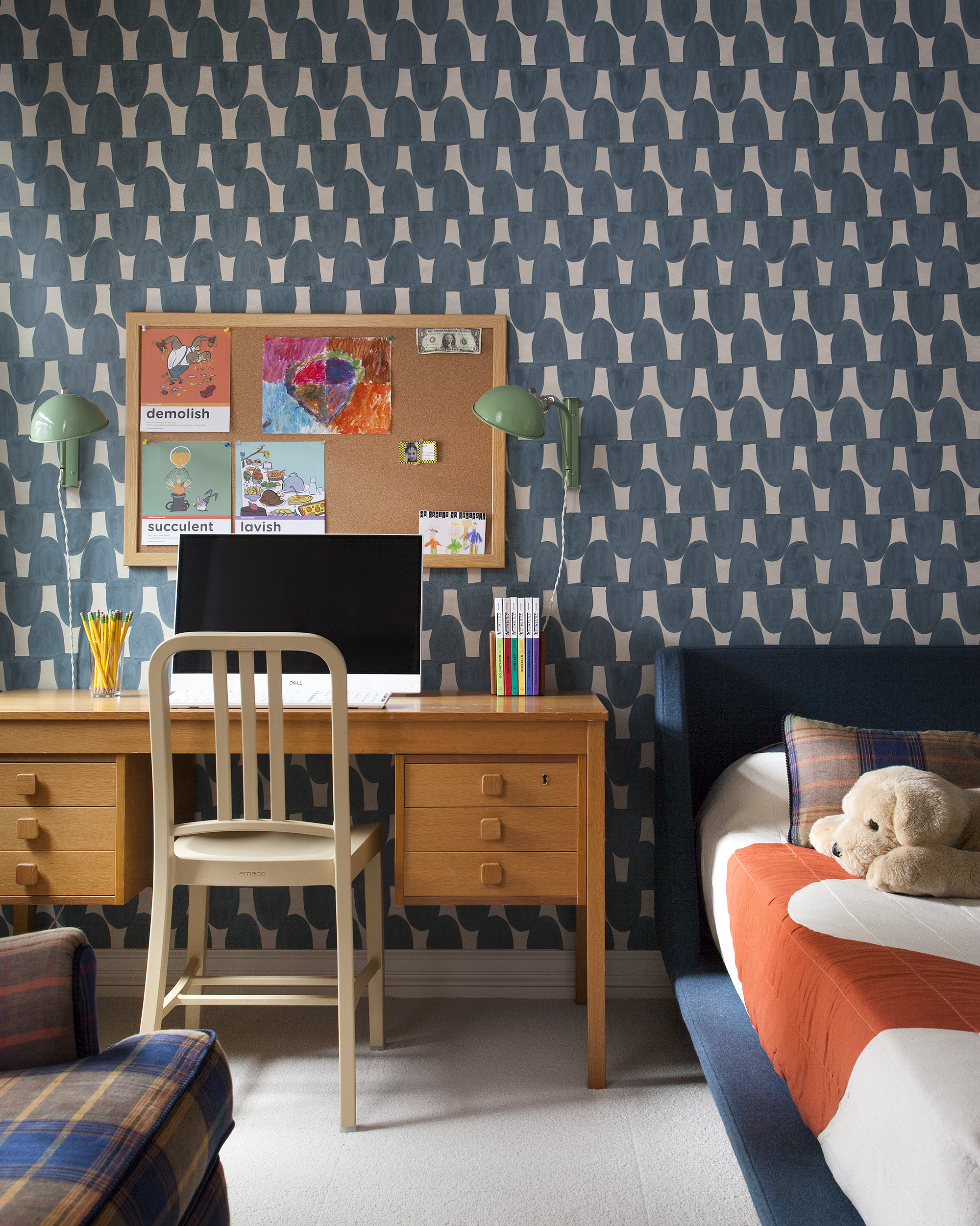 The dining room was brightened up from its original avocado green hue, and the center hall received a fun but delicate Pointillist-style wallpaper by Rebecca Atwood that played off the soft dining room shades. In the children’s bedrooms, bold, graphic wallpaper was installed alongside colorful furnishings to add character and vibrancy.