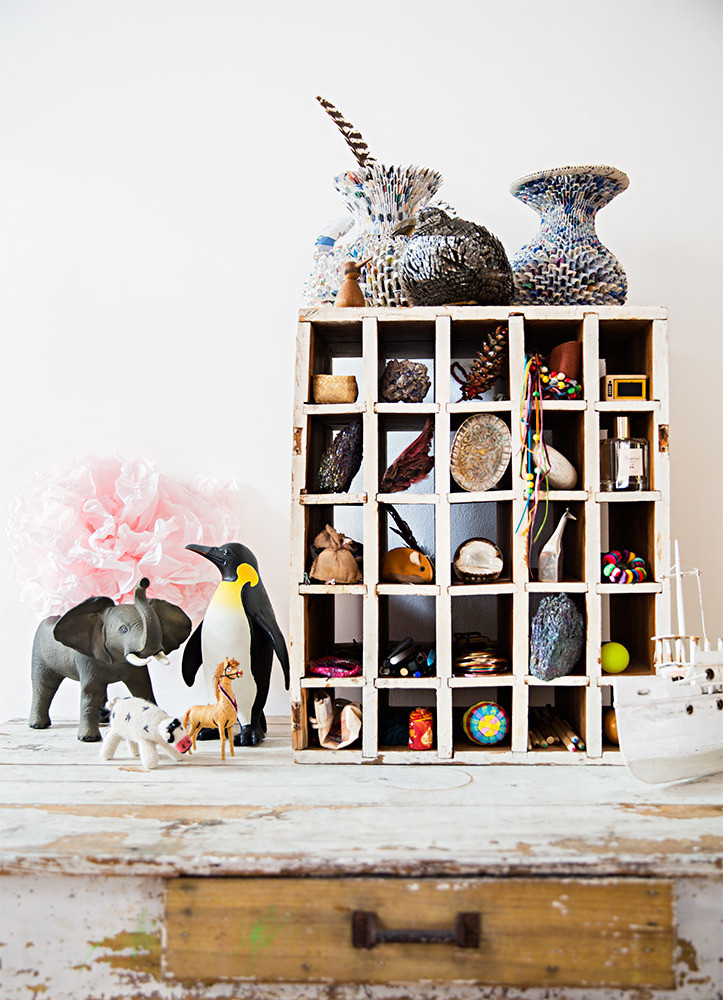 In the girls’ room, one-of-a-kind textiles, handmade crafts, and colorful artwork mingle comfortably among toys and books in a vintage mail sorter.