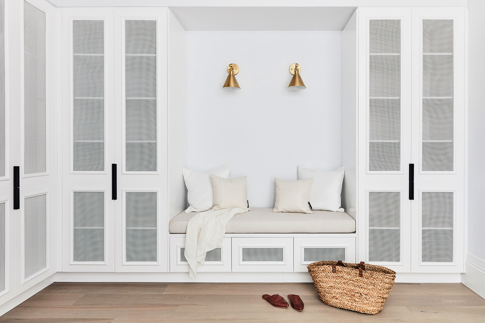 Top an L-shaped bench with cloudlike cushions and suddenly your mudroom will serve triple duty as hidden shoe storage (the top lifts up) and a homework-slash-book nook. It’s also a handy spot to corral one kid while you’re getting the other one ready. Homey touches, like framed family photographs and heavy floral drapes, make the mudroom at Naomi Wilson’s England cottage all the more welcoming to her little ones, who, yes, can get up by themselves. “With the morning light, it’s such a lovely place to come and sit or make a phone call,” says Wilson.