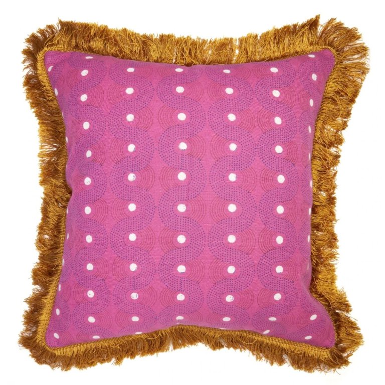 Stitched by hand in Italy with the perfect combination of block-printed magenta fabric, gold cotton fringe, and artist Paboy Bojang’s striking signature red zipper, this pillow from Block Shop brings haute couture home.